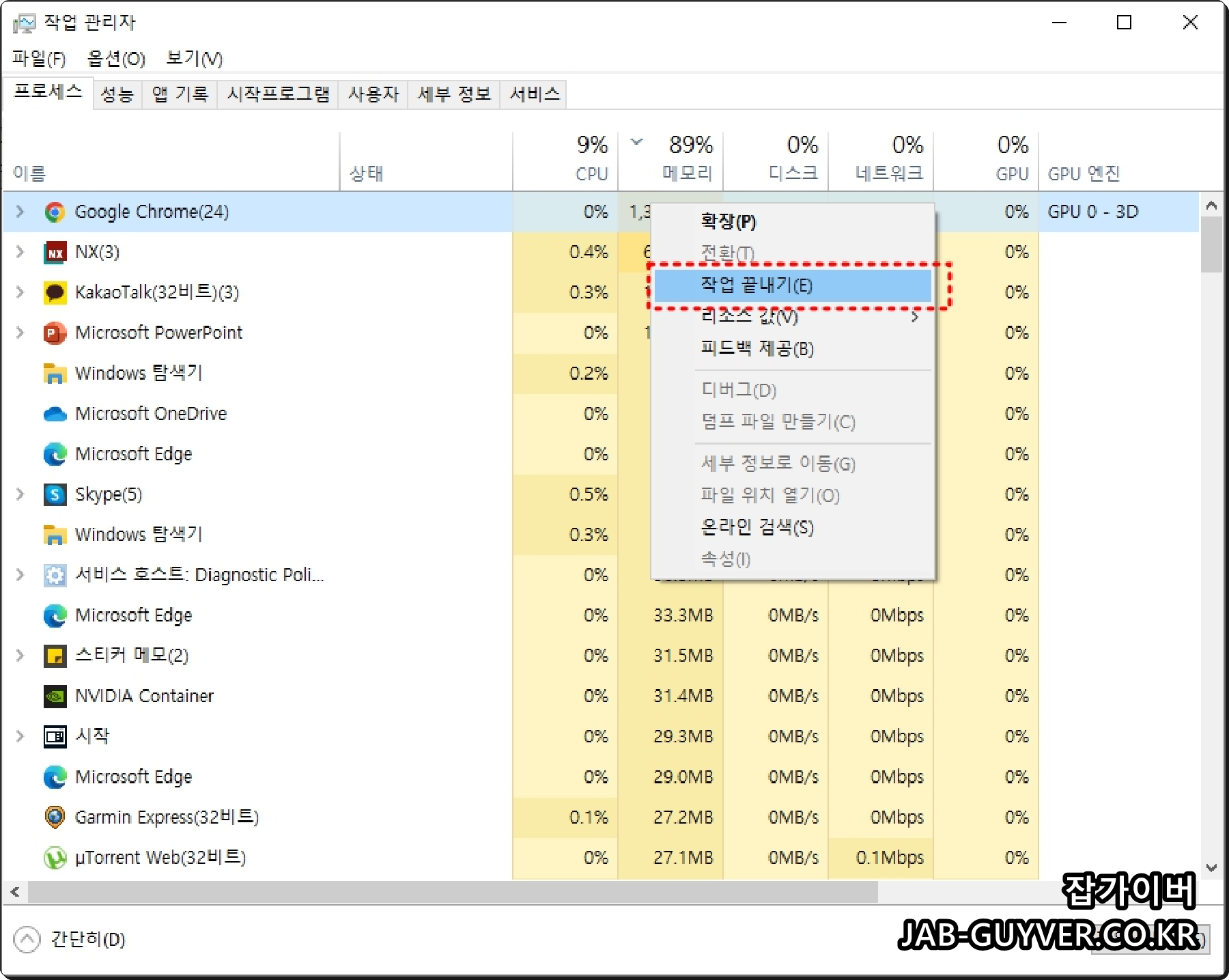 - 메모리 사용량이 높은 프로그램을 선택한 후, "작업 끝내기"를 클릭하여 종료합니다.