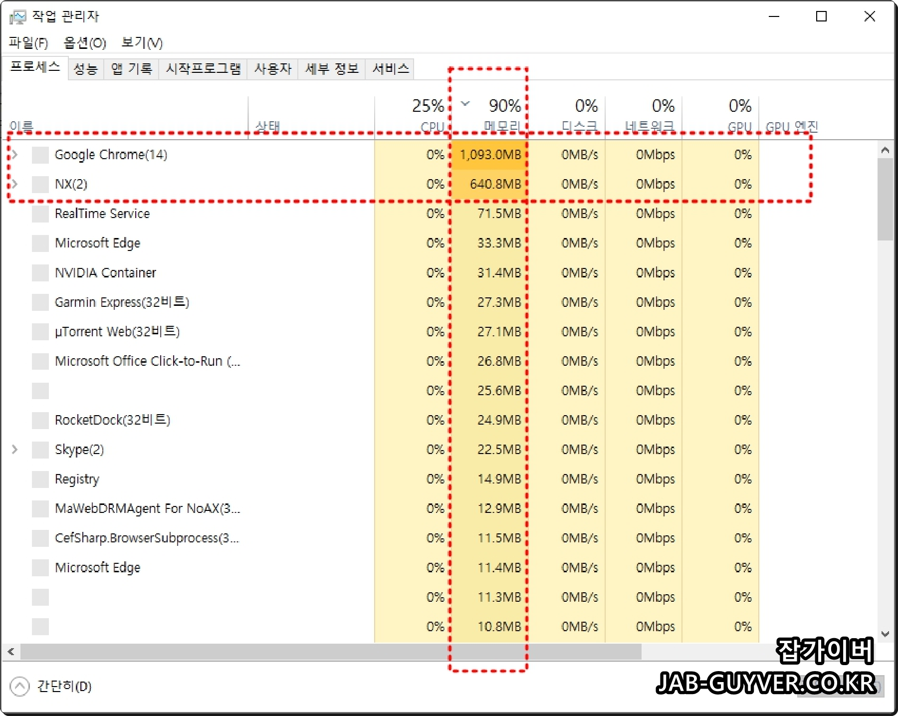 - "프로세스" 탭에서 메모리 사용량을 기준으로 프로그램을 정렬합니다.