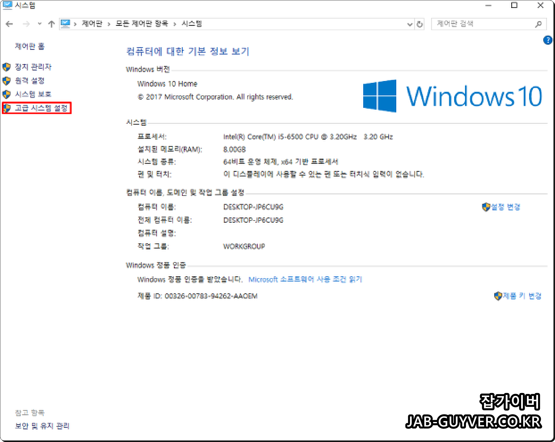 윈도우10 및 윈도우8, 윈도우7의 경우 제어판 -> 시스템 -> 고급 시스템 설정으로 들어갑니다.