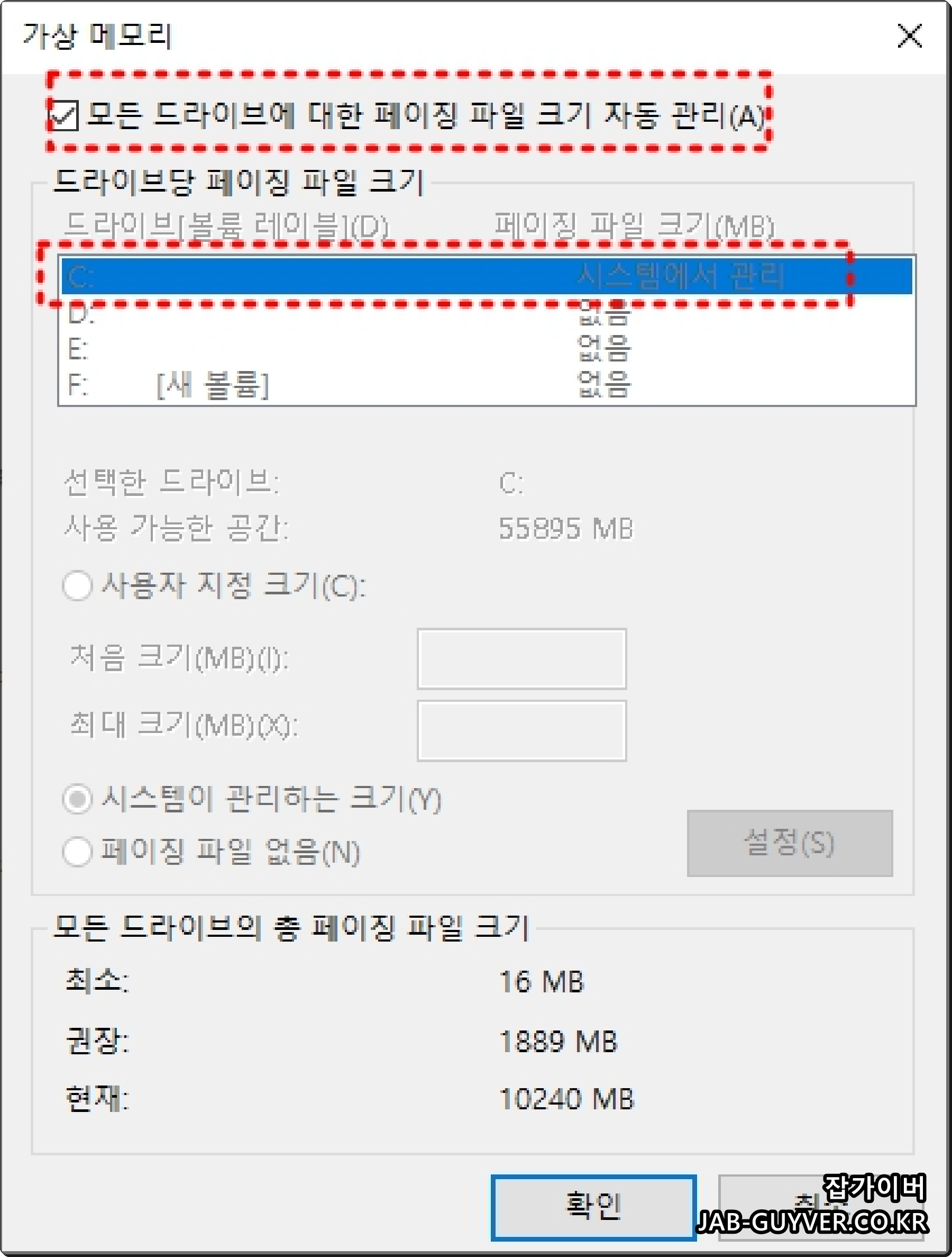 또는 임시적으로 "모든 드라이브에 대해 자동 관리"로 돌려 설정 충돌을 해소한 후 다시 수동 설정을 시도합니다.