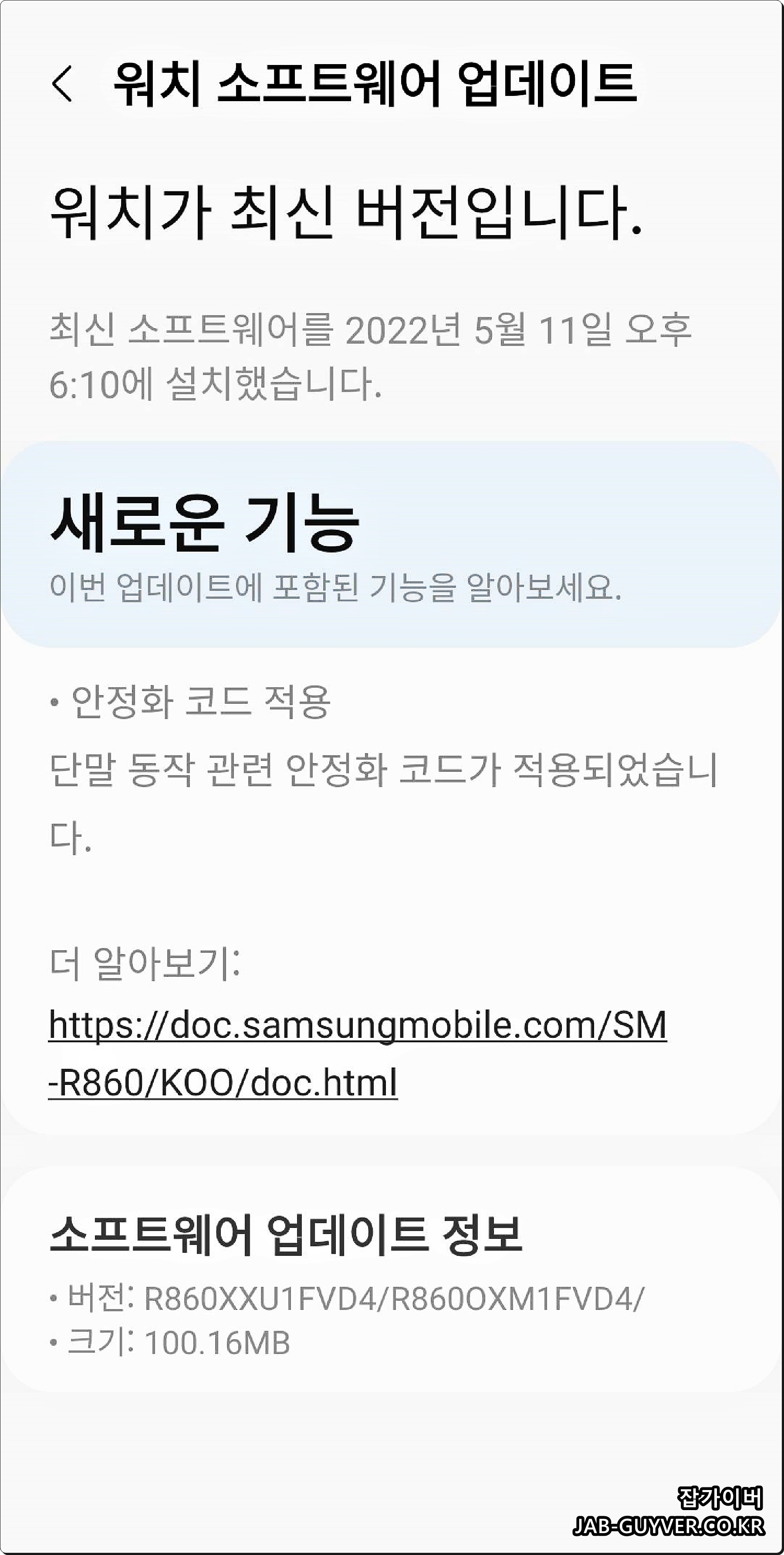 이후 다시 워치정보로 들어가면 현재 갤럭시워치 소프트웨어 업데이트 버전을 확인할 수 있으며 해당 업데이트에 대한 기능을 확인할 수 있습니다.