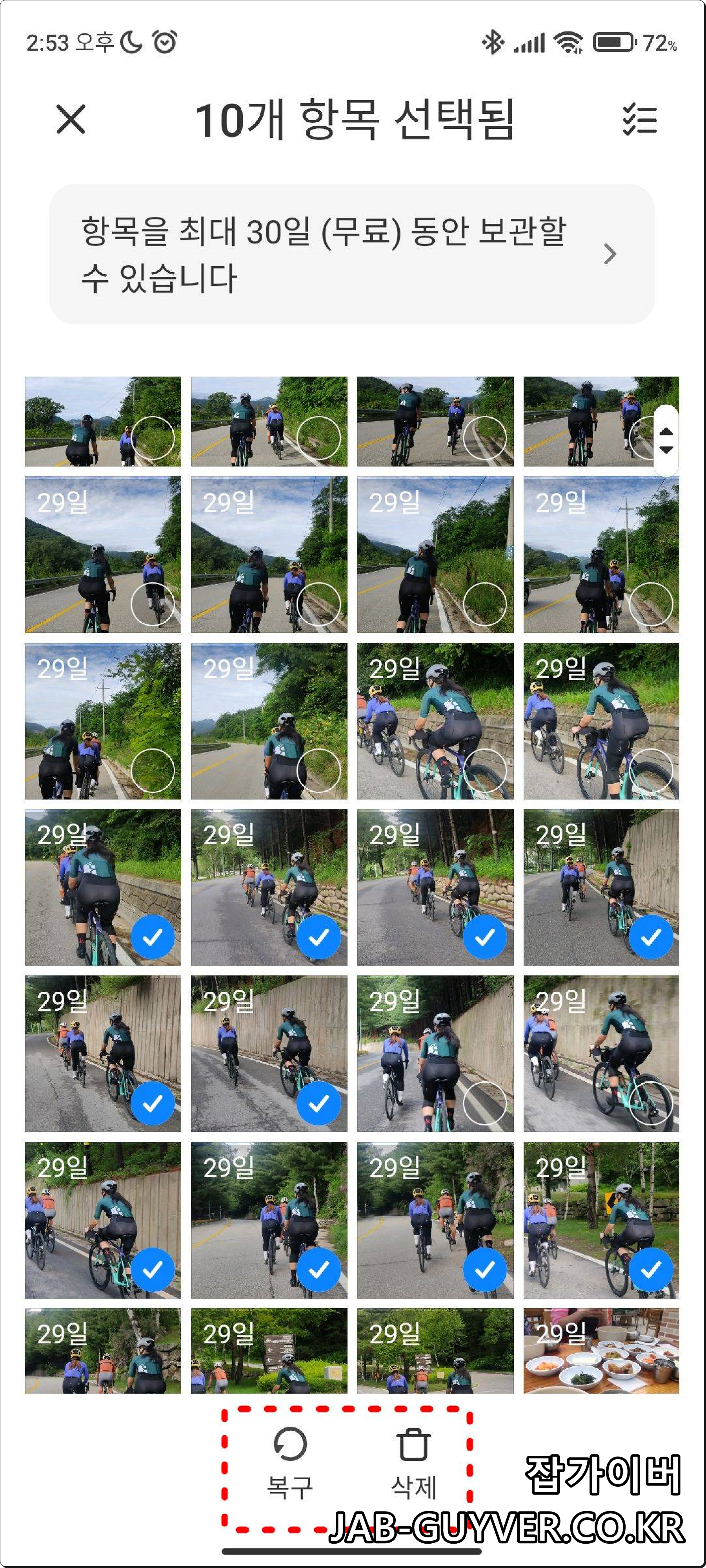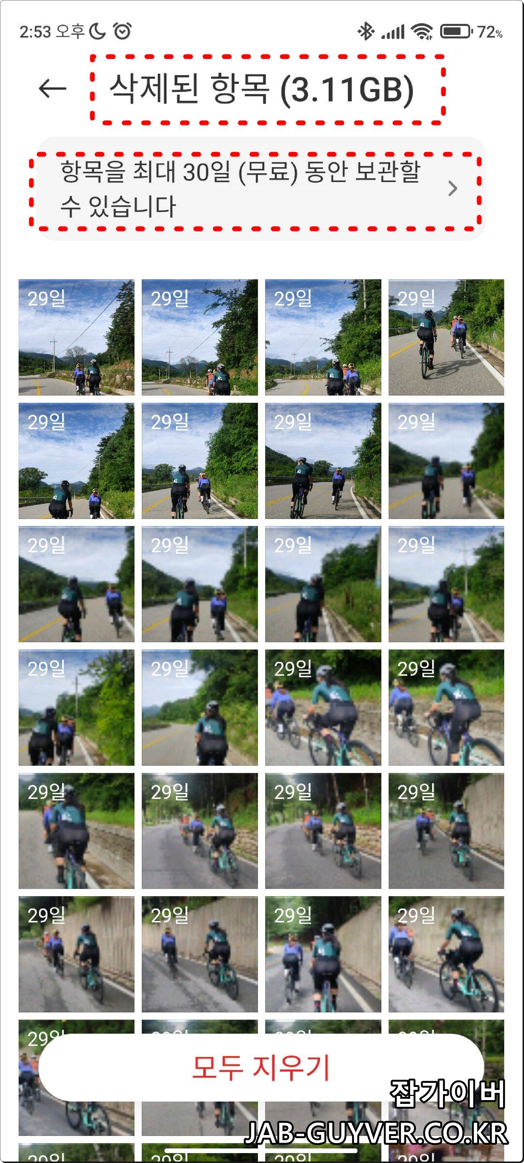 핸드폰 갤러리에서 사진정리 -> 쓰레기통으로 들어가면 최근30일간 삭제한 사진이 표시됩니다.