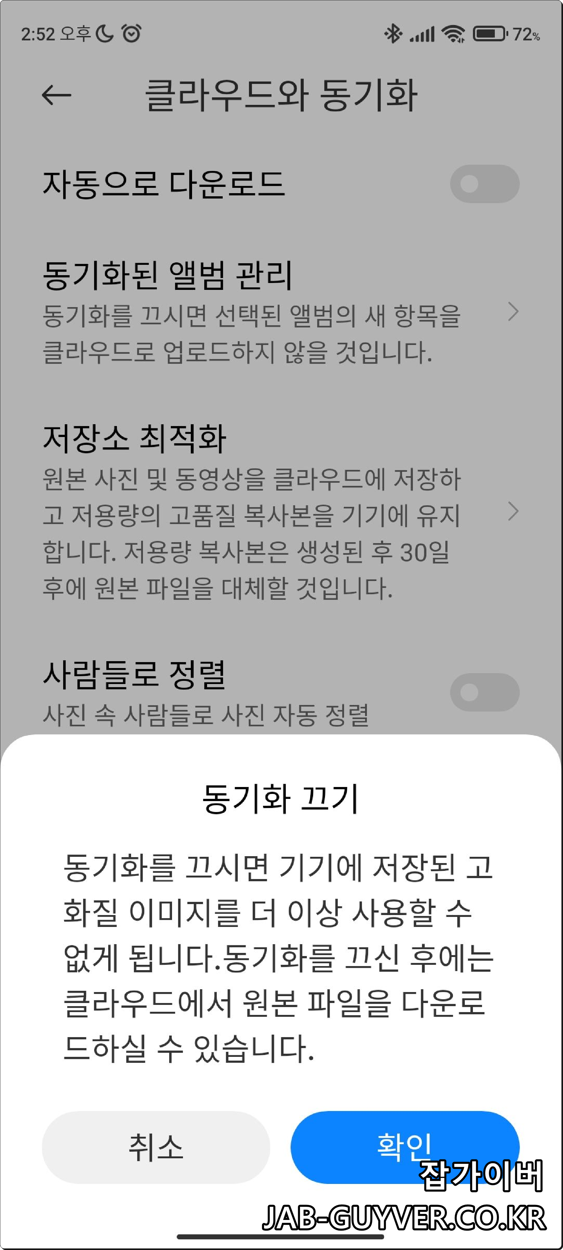 이때 사진 및 동영상 클라우드 백업 동기화 시 모바일데이터가 아닌 와이파이 상태에서만 백업되게 설정할 수 잇으며 클라우드 용량이 부족한 경우 원본 사진 및 동영상을 클라우드에 저장하고 저용량의 고화질 복사본을 기기에 별도로 저장하는 방식으로 진행되며 이후 30일이 지나면 원본 파일로 대체되도록 설정할 수 있습니다.