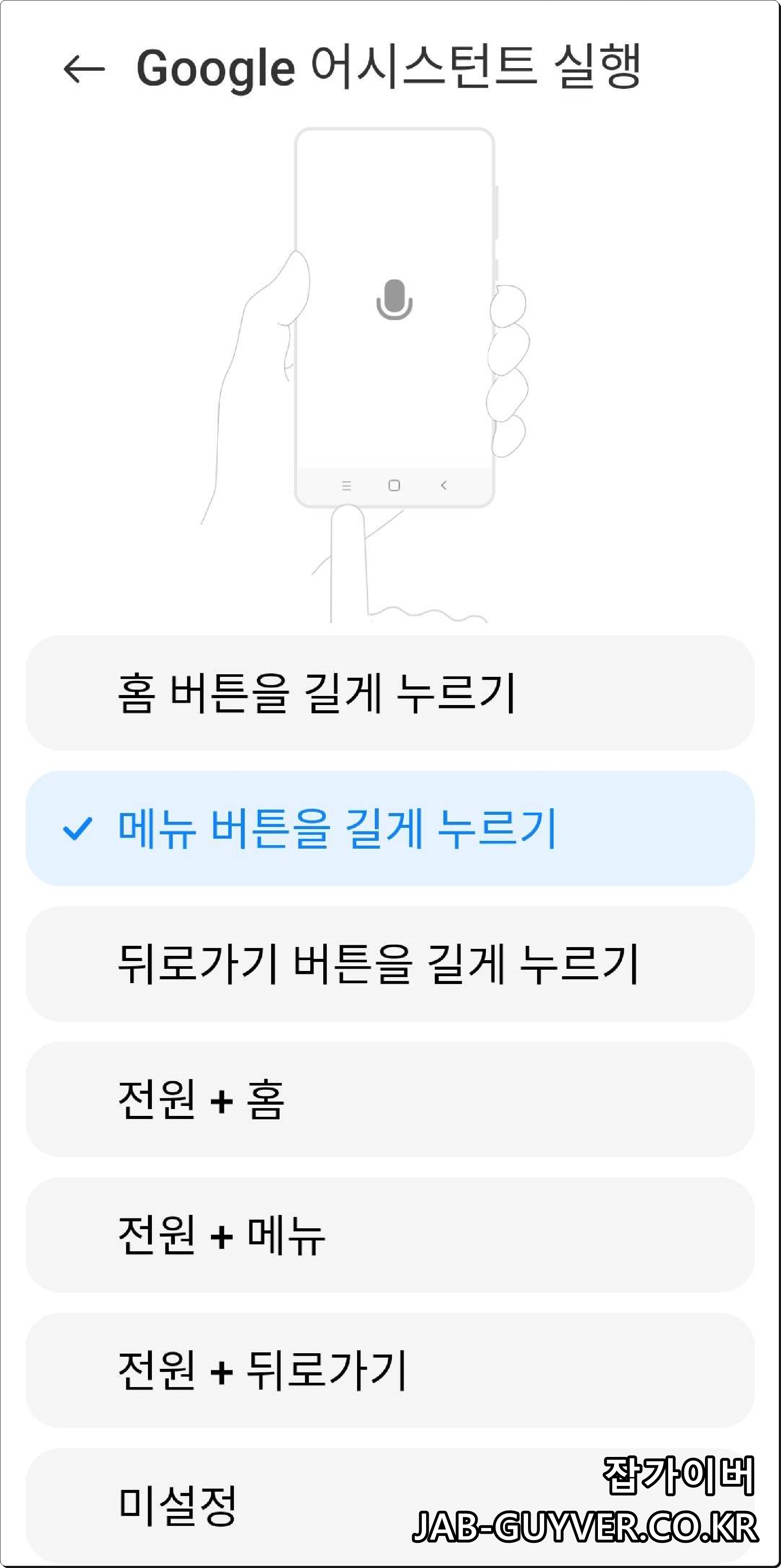구글 어시스턴트 실행이 버튼 조합에 묶여 있다면 해당 항목을 선택한 뒤, 기능을 “미설정”으로 변경하면 됩니다. 이렇게 하면 해당 버튼 조합으로는 아무것도 실행되지 않게 되고, 실수로 어시스턴트가 켜지는 일도 자연스럽게 사라집니다.