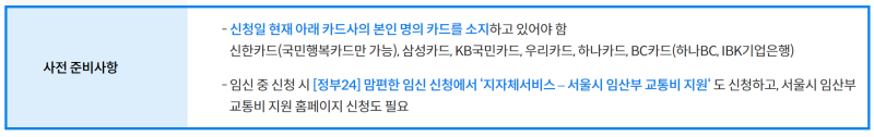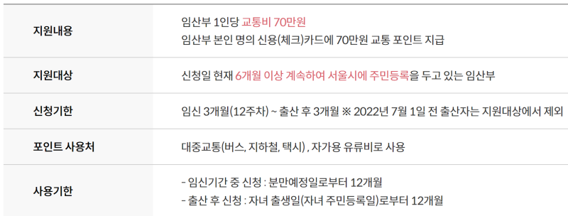 | 지원내용 | 임산부 1인당 교통비 70만원 지원 임산부 본인명의 신용카드 및 체크카드로 70만원 교통포인트 지급 |
