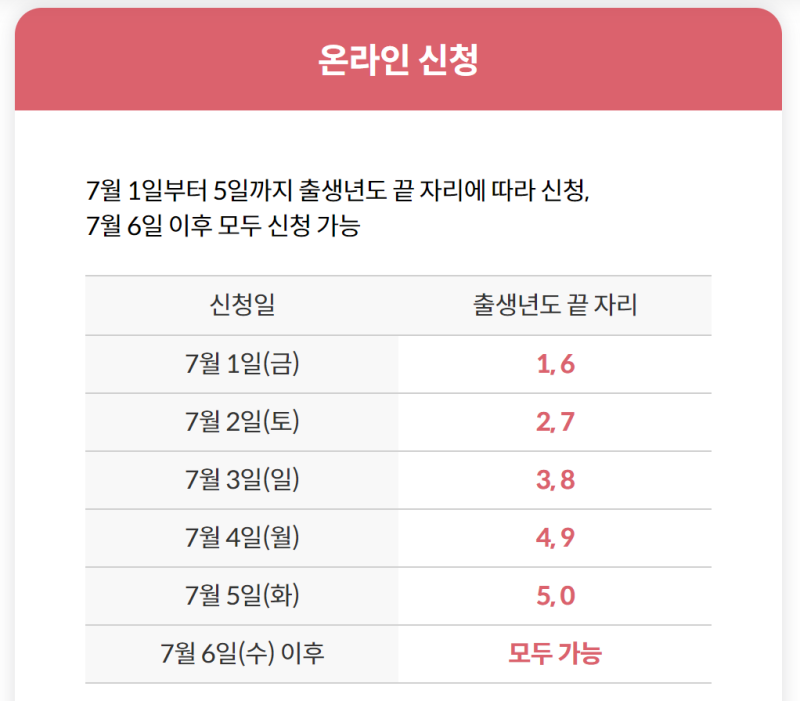 사람들이 몰리느것을 방지하기 위해 7월 1일부터 5일까지는 출생년도 끝자리 기준 신청이 가능하며 7월 6일 이후부터는 상관없이 지원가능합니다.