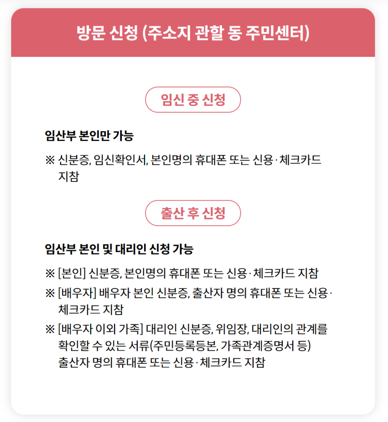 교통비 지원은 주소지 관할 주민센터 방문으로 신청가능하며 임산부일 경우에는 임산부 본인만 가능하며 출산 이후에는 임산부 본인 및 대리인도 신청 가능합니다.