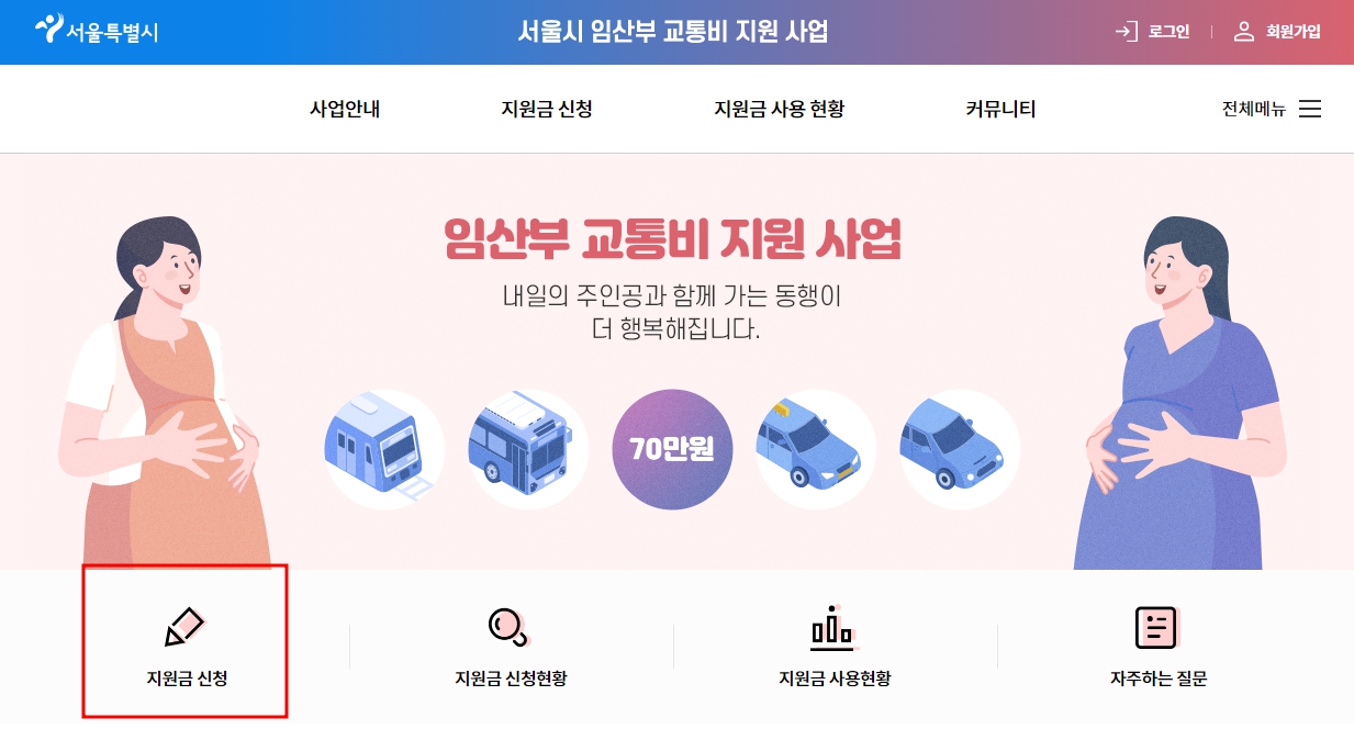 지원 대상 : 교통비 지원 신청일을 기준으로 6개월 이상 계속하여 서울시에 거주하며 주민등록등본산에 기재되어 있는 임산부만 지원 대상에 포함됩니다.