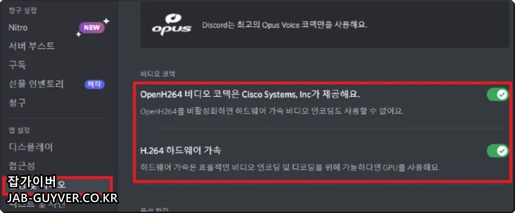 디스코드 음성 및 비디오에서 화면공유 고급기술 캡쳐기능을 비활성화합니다.