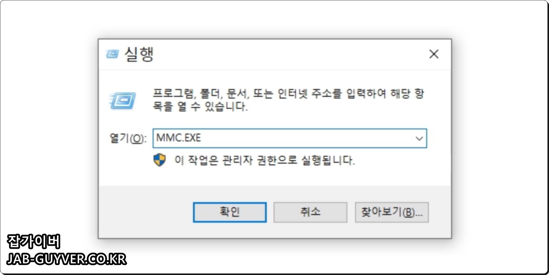 윈도우 키 + R을 눌러 실행 창에 MMC.EXE 입력 후 확인을 눌러줍니다.