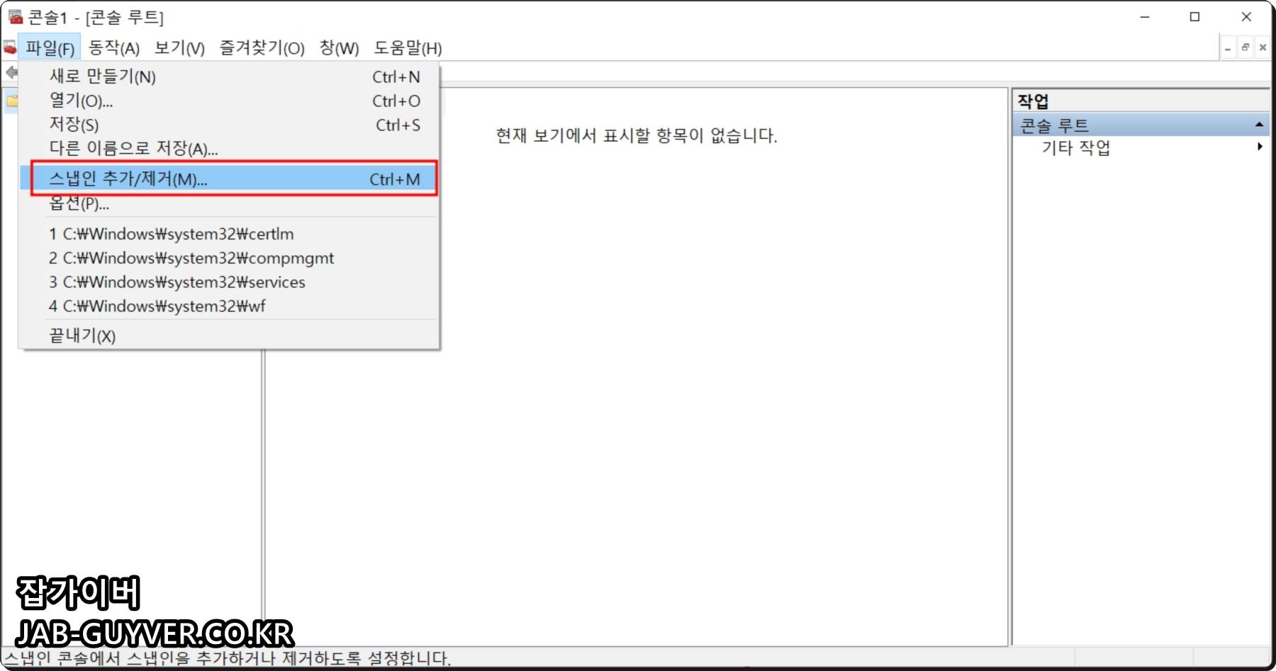 스냅인 추가 / 제거를 눌러 인증서를 추가합니다