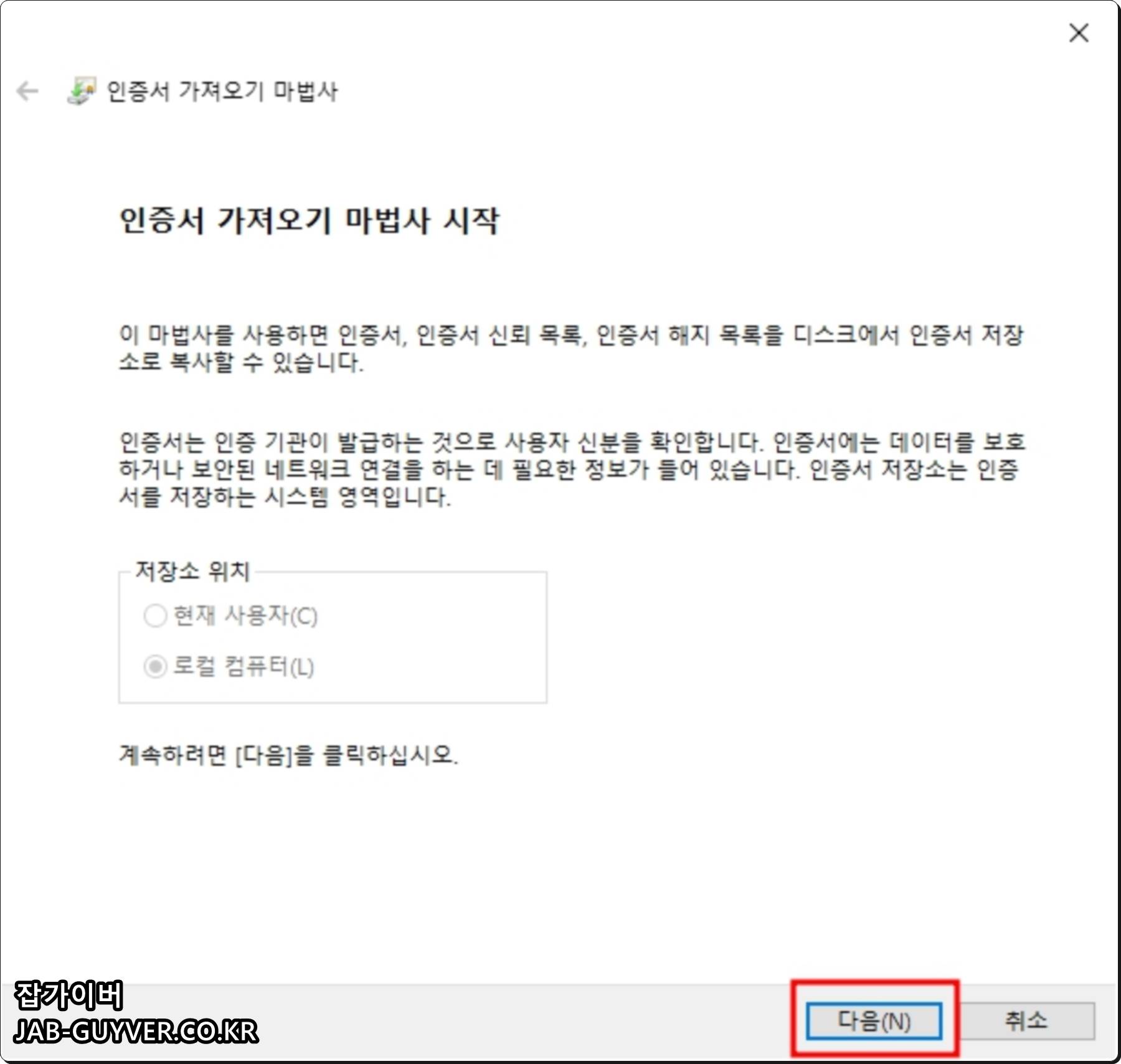 이때 인증서 설치경로는 "로컬 컴퓨터→모든 인증서를 다음 저장소에 저장→신뢰할 수 있는 루트 인증 기관'를 지정합니다.