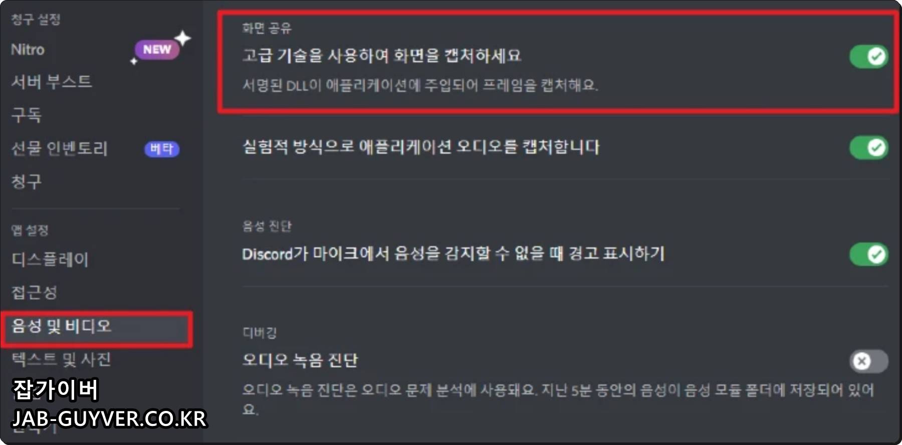 디스코드 음성 및 비디오에서 화면공유 고급기술 캡쳐기능을 비활성화합니다.