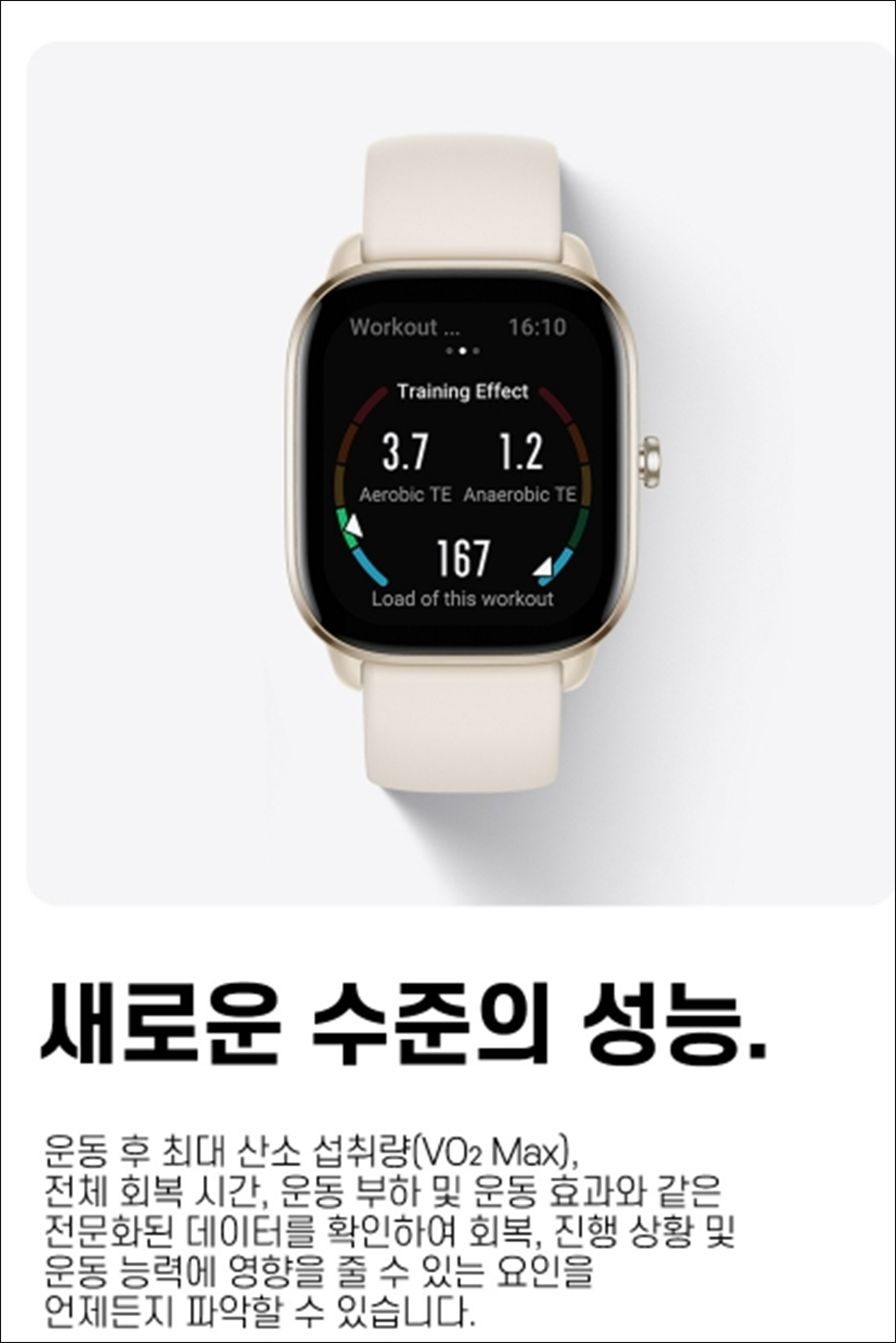 그외에도 이번에 새롭게 도입된 Peakbeats 알고니즘과 Virtual Pacer을 지원하는데 이는 GTS3 처음 도입된 기능으로서 최대산소 섭취량 (VO2 Max), 전체 회복 시간, 훈련 부하 및 훈련 효과와 같은 전문 데이터를 평가하는 새로운 자체 개발 모션 알고리즘이 탑재되어 있습니다. 회복, 진행 및