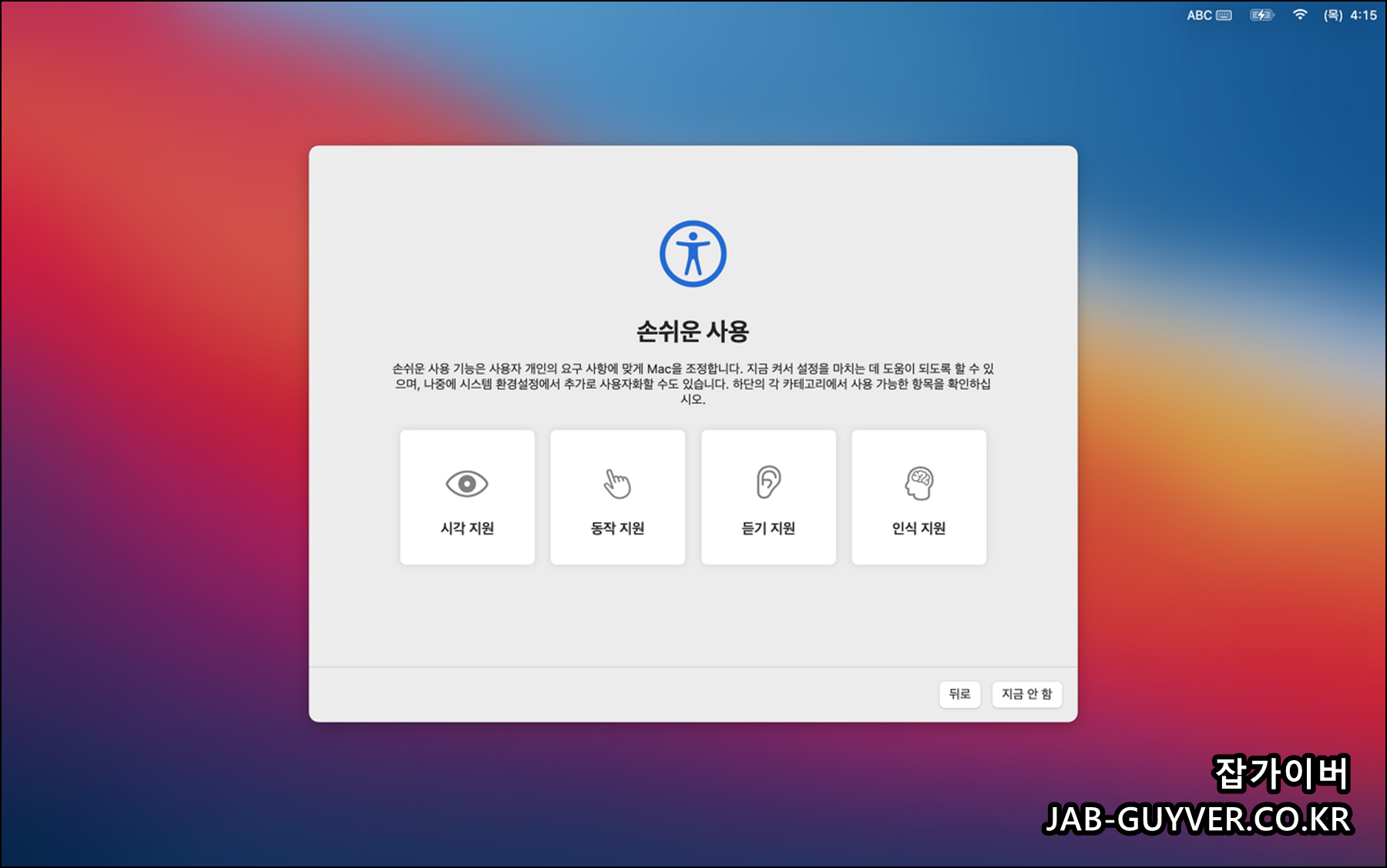 - 손쉬운 사용 설정: MacOS는 접근성을 높이기 위한 다양한 옵션을 제공합니다. 시각, 청각, 키보드 및 마우스 관련 설정을 편리하게 변경할 수 있습니다.