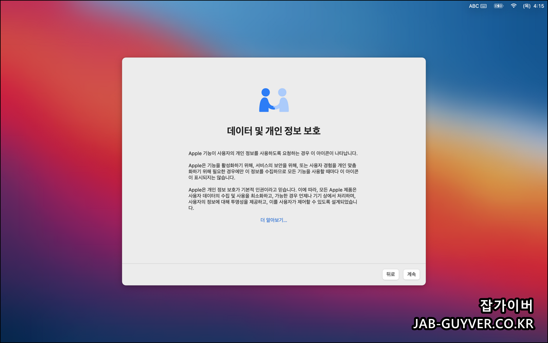 - 데이터 및 개인정보 보호: MacOS는 개인 정보 보호를 중요하게 생각합니다. iCloud 계정 로그인 및 데이터 공유 설정을 선택합니다.
