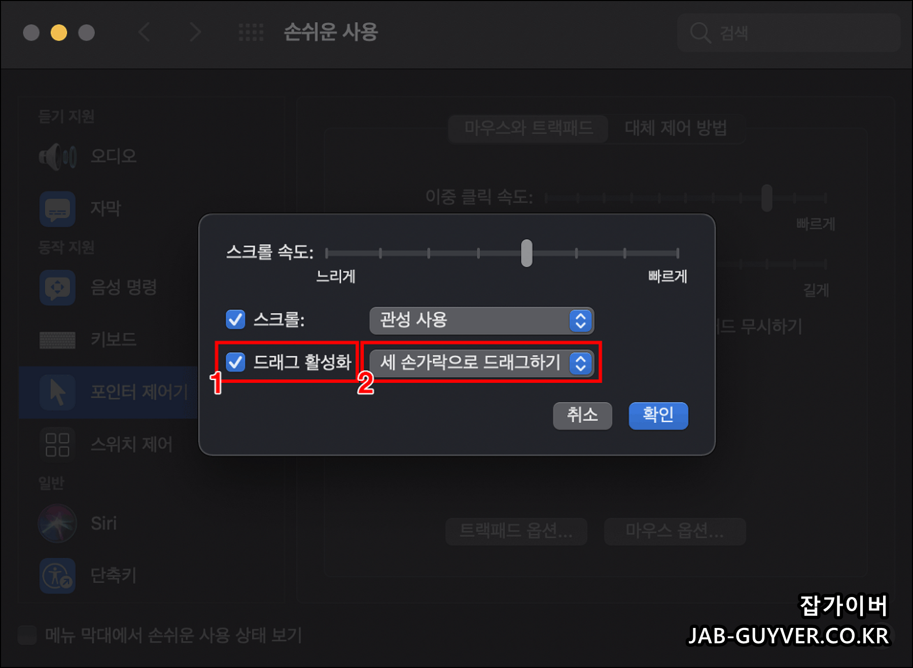 포인터 제어기에서 트랙패드 옵션을 통해 맥북 트랙패드에서 스크롤이나 드래그 활성화를 손가락으로 드래그하느것으로 변경하거나 속도조절에 대한 감도설정이 가능합니다.