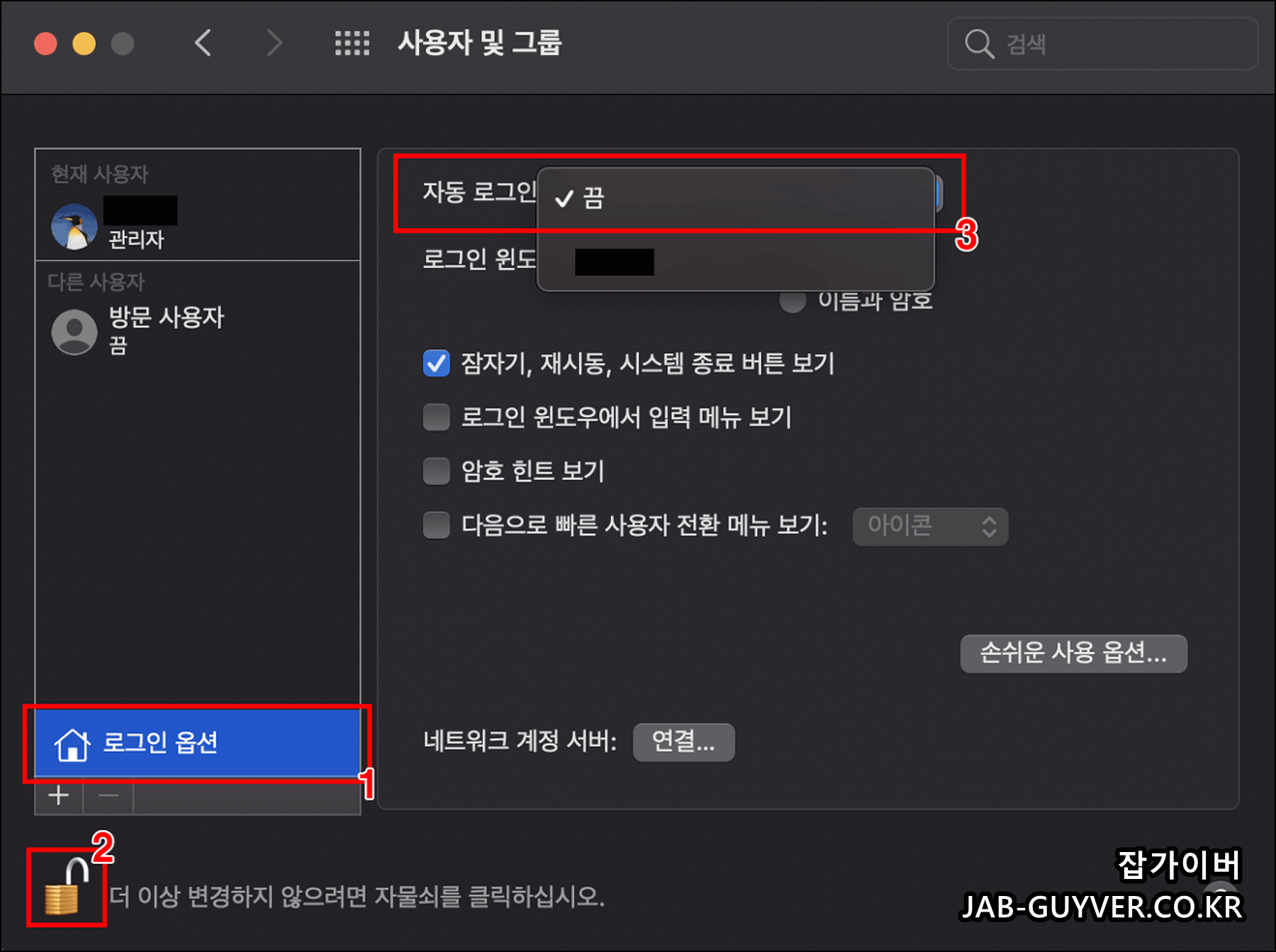 로그인 옵션을 자동로그인을 자물쇠를 체크합니다.