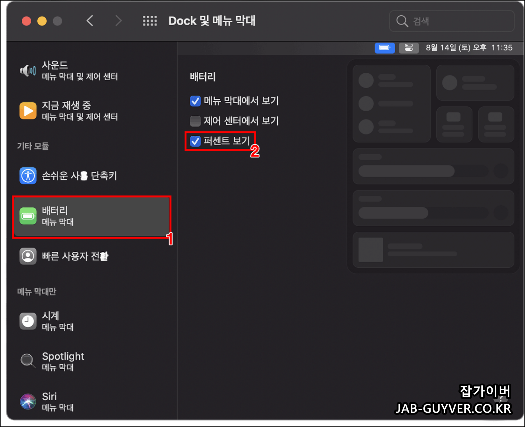 맥북 배터리 잔량을 확인하기 위해서 배터리 메뉴도 보기편한 퍼센티지 "%"로 변경해줍니다.