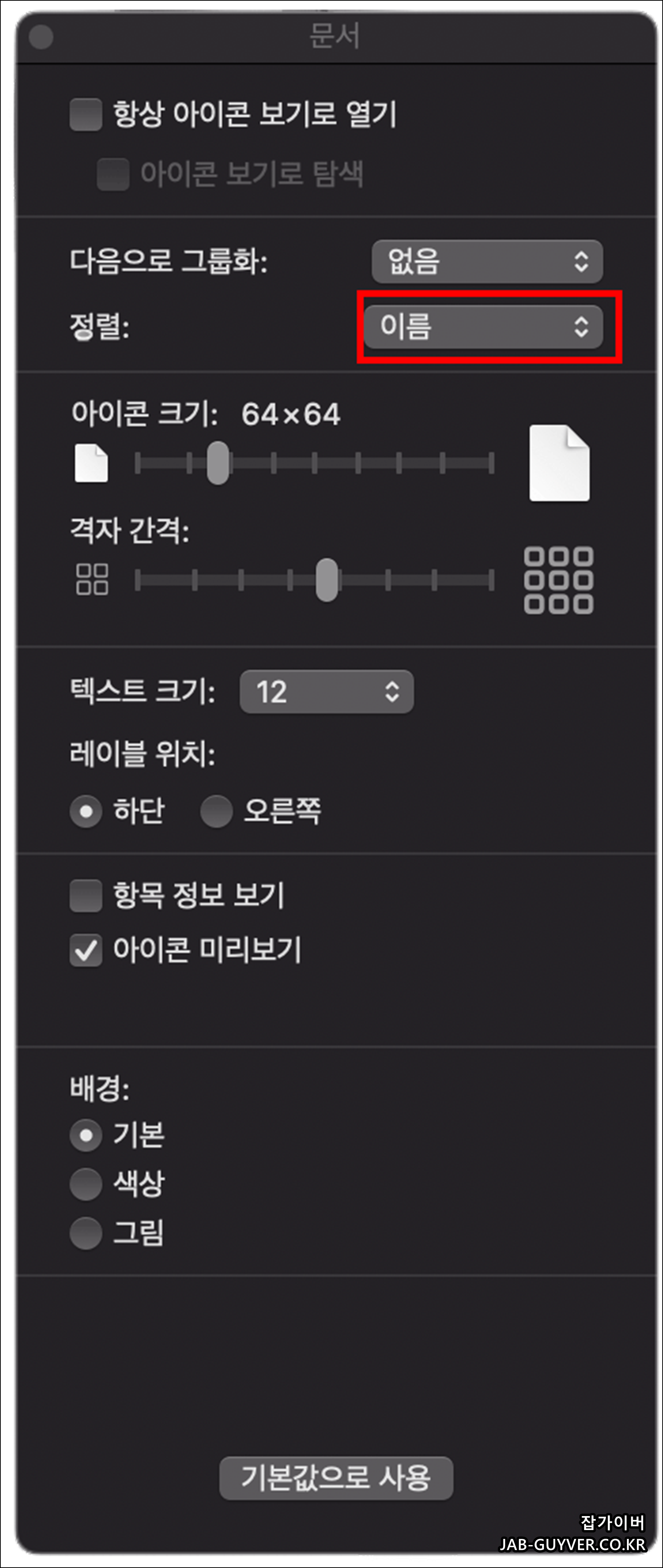 마우스 우클릭 -> 보기옵션울 통해 정렬 방식 및 아이콘 크기, 격자간격등을 조절합니다.
