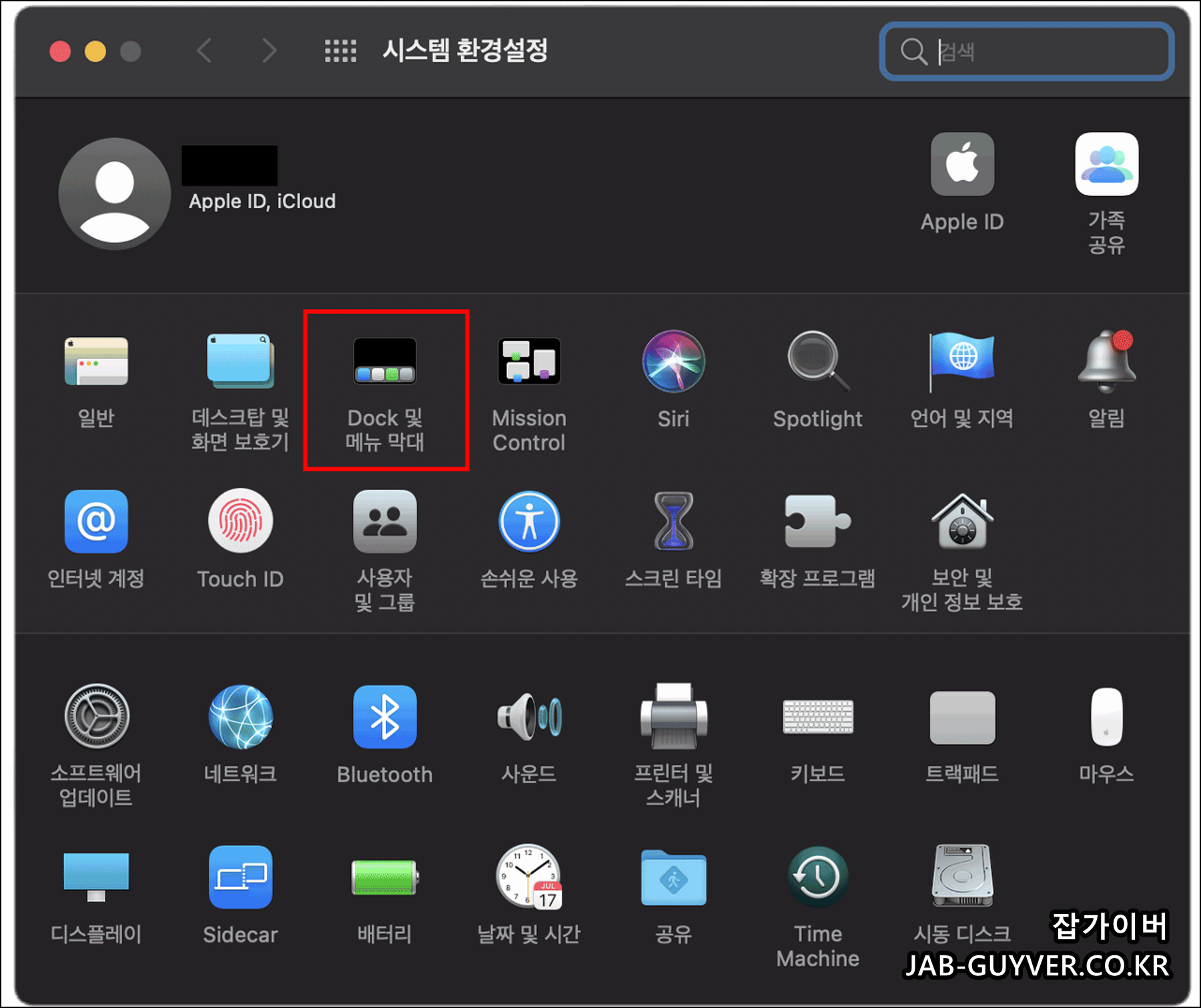 Dock 및 메뉴막대를 선택합니다.