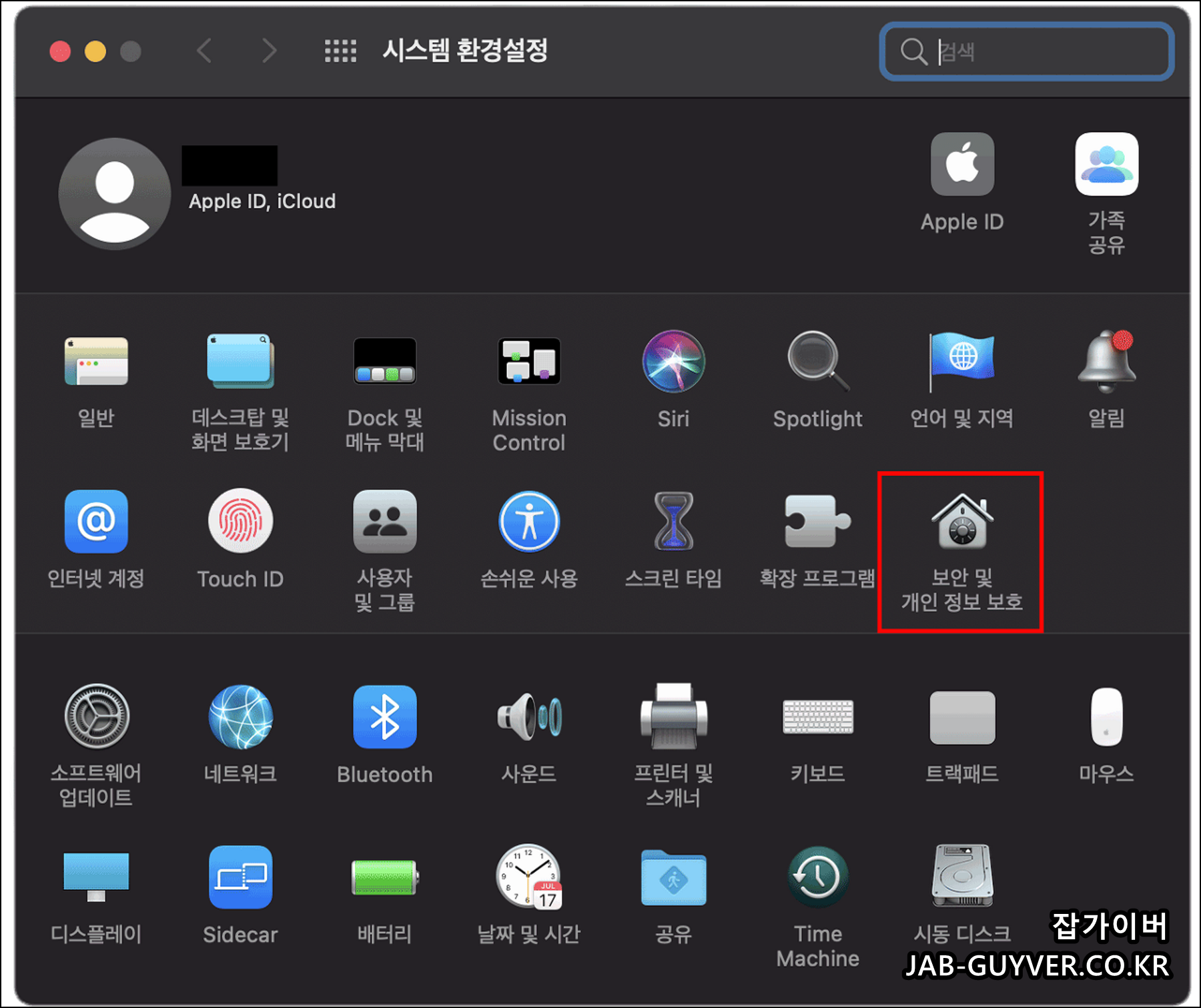시스템 환경설정 -> 보안 및 개인정보 보호를 선택합니다.