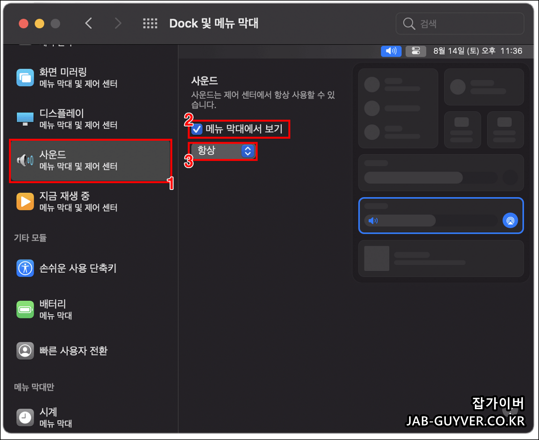 사운드 또한 메뉴막대에서 보기를 항상으로 체크해줍니다.