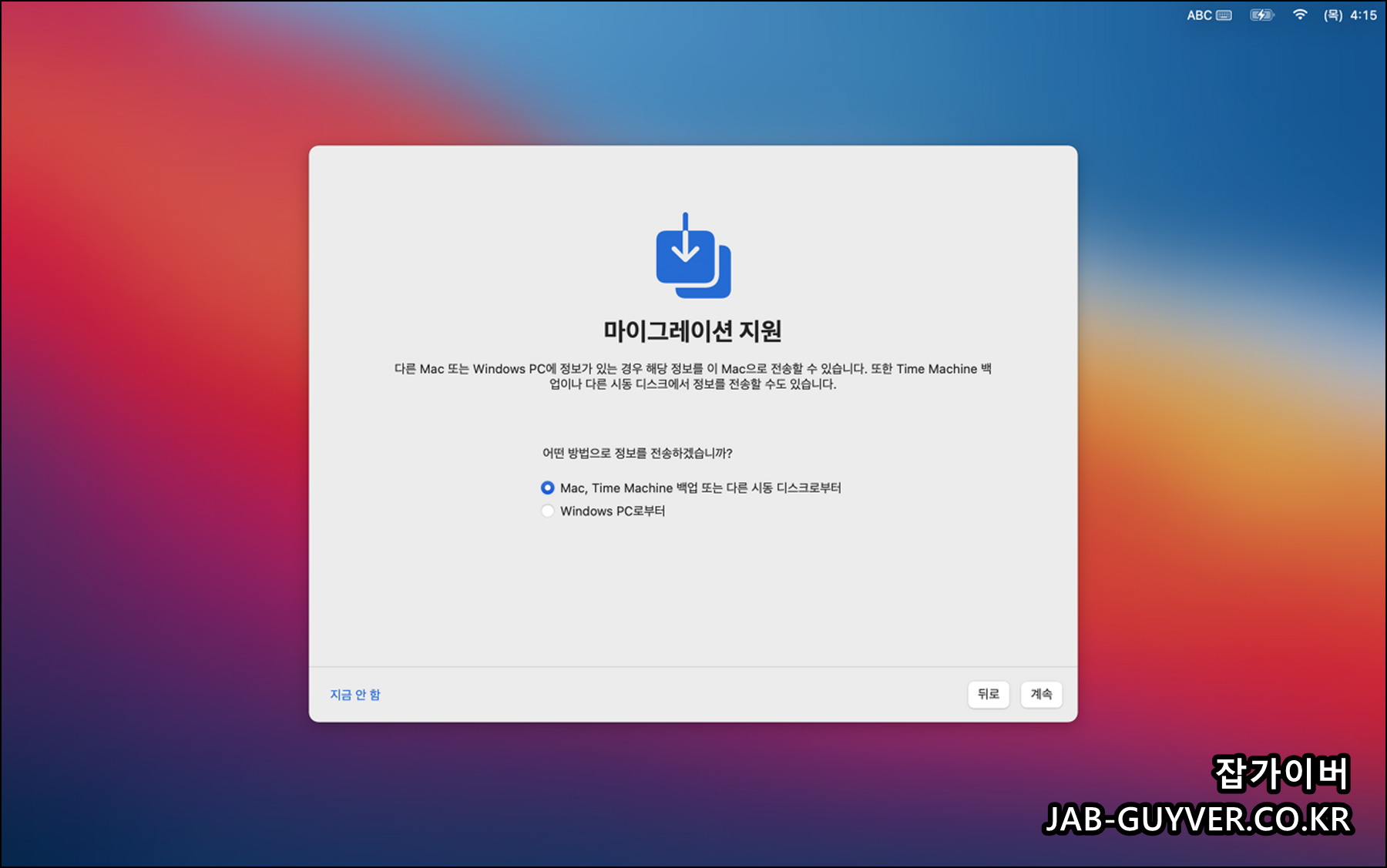 - 마이그레이션: 이 부분은 이전에 사용하던 컴퓨터에서 데이터를 가져오는 경우에 사용됩니다. 이전의 데이터를 MacOS로 마이그레이션하려면 이 설정을 사용합니다.