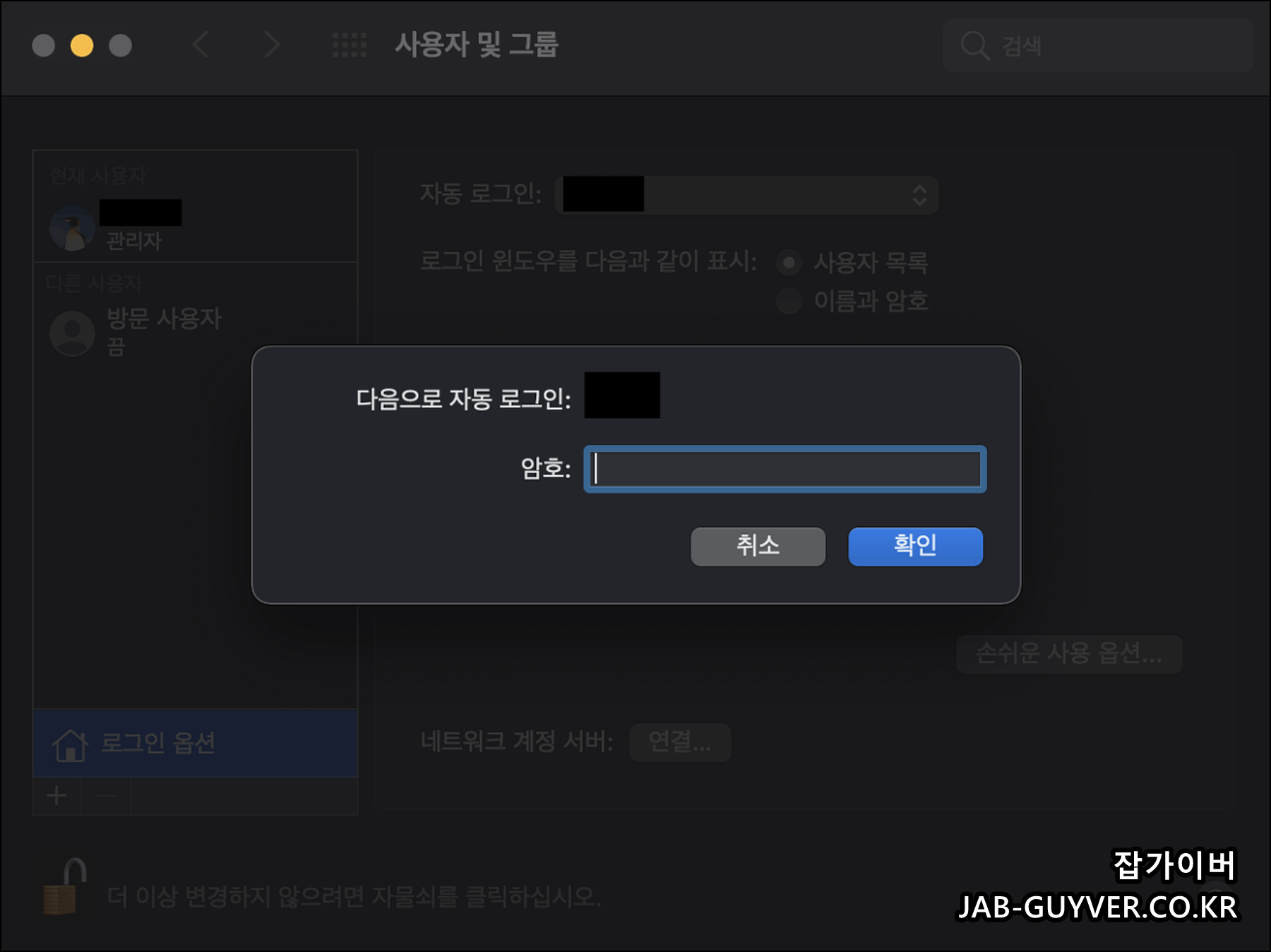 맥북 부팅 시 매번 로그인 암호를 입력하느게 싫다면 비밀번호 비활성화해서 자동로그인 되도록 설정합니다.