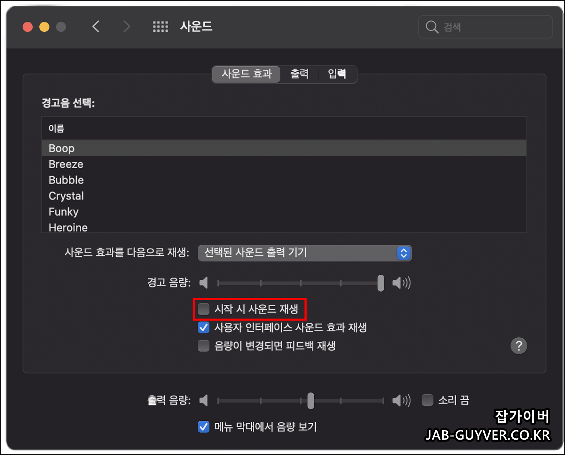 사운드에서 맥북 부팅 시 사운드 재생을 체크해제합니다.