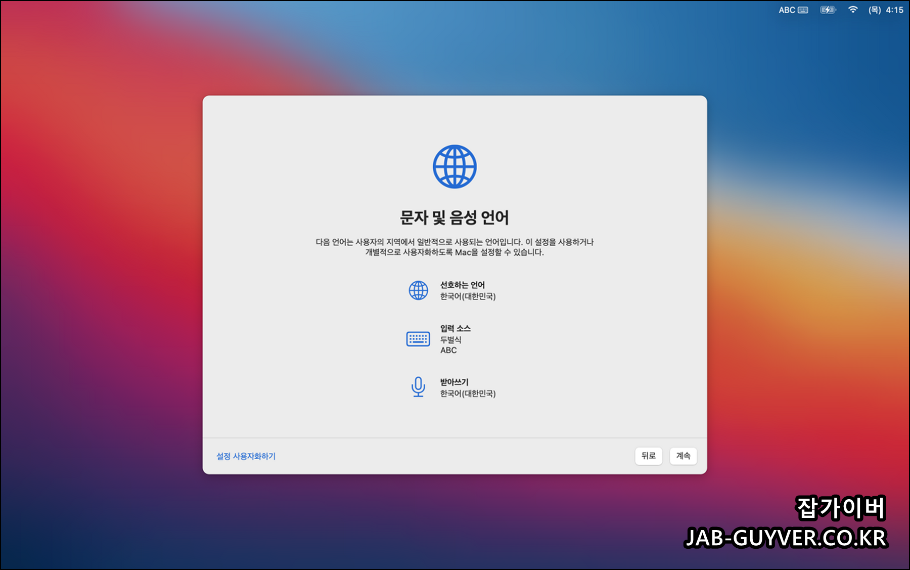 - 국가 및 지역 설정: 처음 맥북을 부팅하면 국가 및 지역 설정을 선택할 차례입니다. 대한민국을 선택하면 한국어 언어로 자동 설정됩니다.