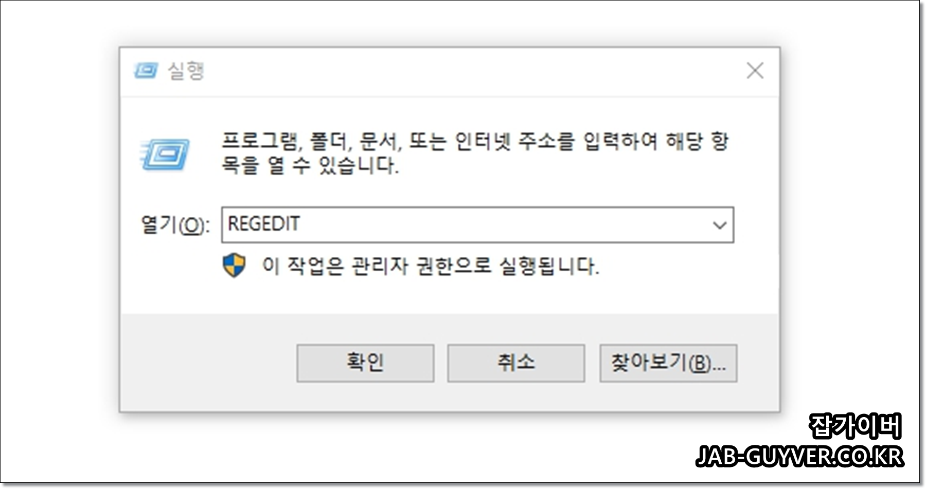 윈도우 키 + R을 눌러 실행창에 Regedit 입력 후 확인을 눌러 레지스트리 편집기를 실행합니다.