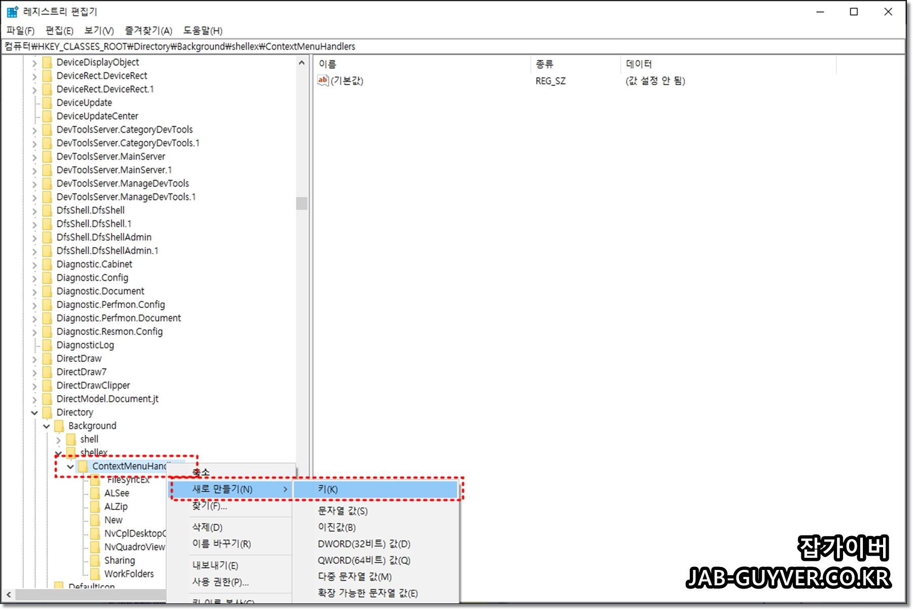 ContextMenuHandlers 항목을 선택 후 마우스 우클릭 해서 새로만들기 -> 키(k)를 선택합니다.
