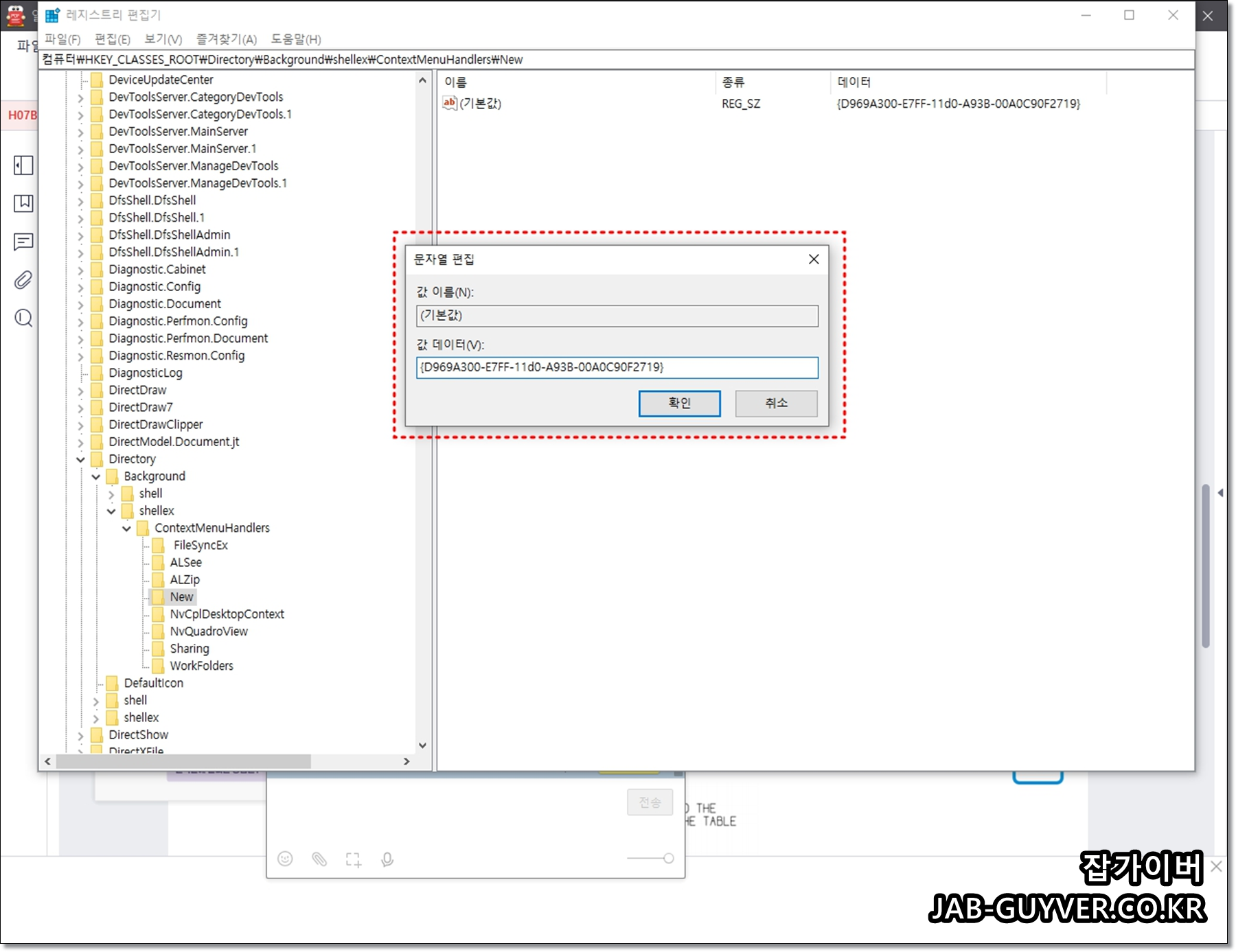 그리고 만들어진 기본값 키값 이름을 수정을 눌러 값 데이터(v)에 아래 값을 추가합니다.