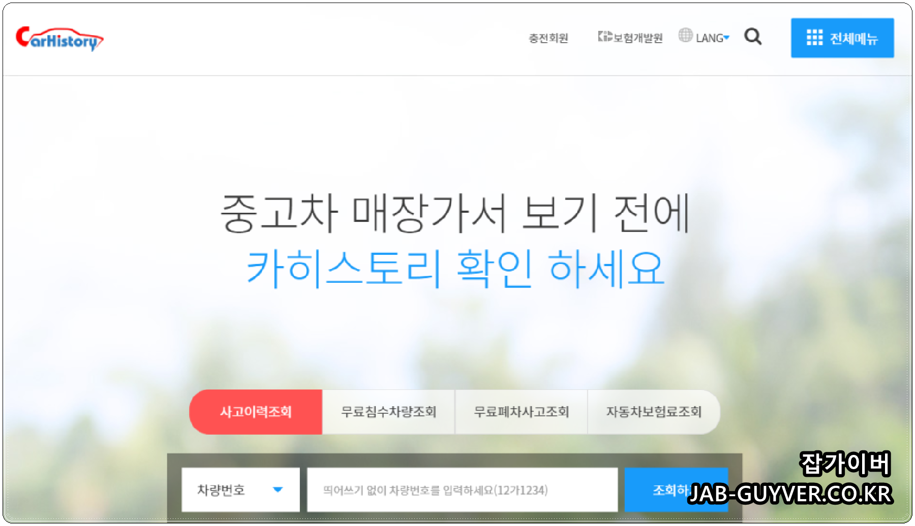 카히스토리 홈페이지에 접속해서 중고차량을 구입할 경우 사고이렴 및 침수차량, 폐차사고, 자동차보험료등을 차량번호를 통해 조회할 수 있습니다.
