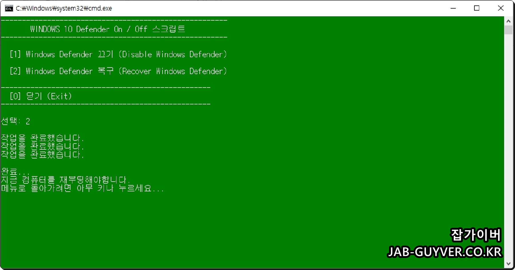 여기서 1번을 눌러주면 시간이 좀 소요되고 윈도우디펜더 끄기가 완료됩니다.