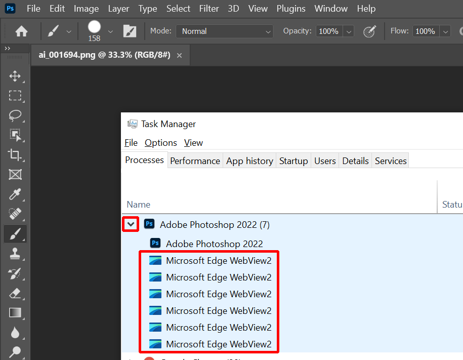 우선 작업관리자에서 현재 실행 중인 Microsoft Edge WebView2 강제로 종료합니다.