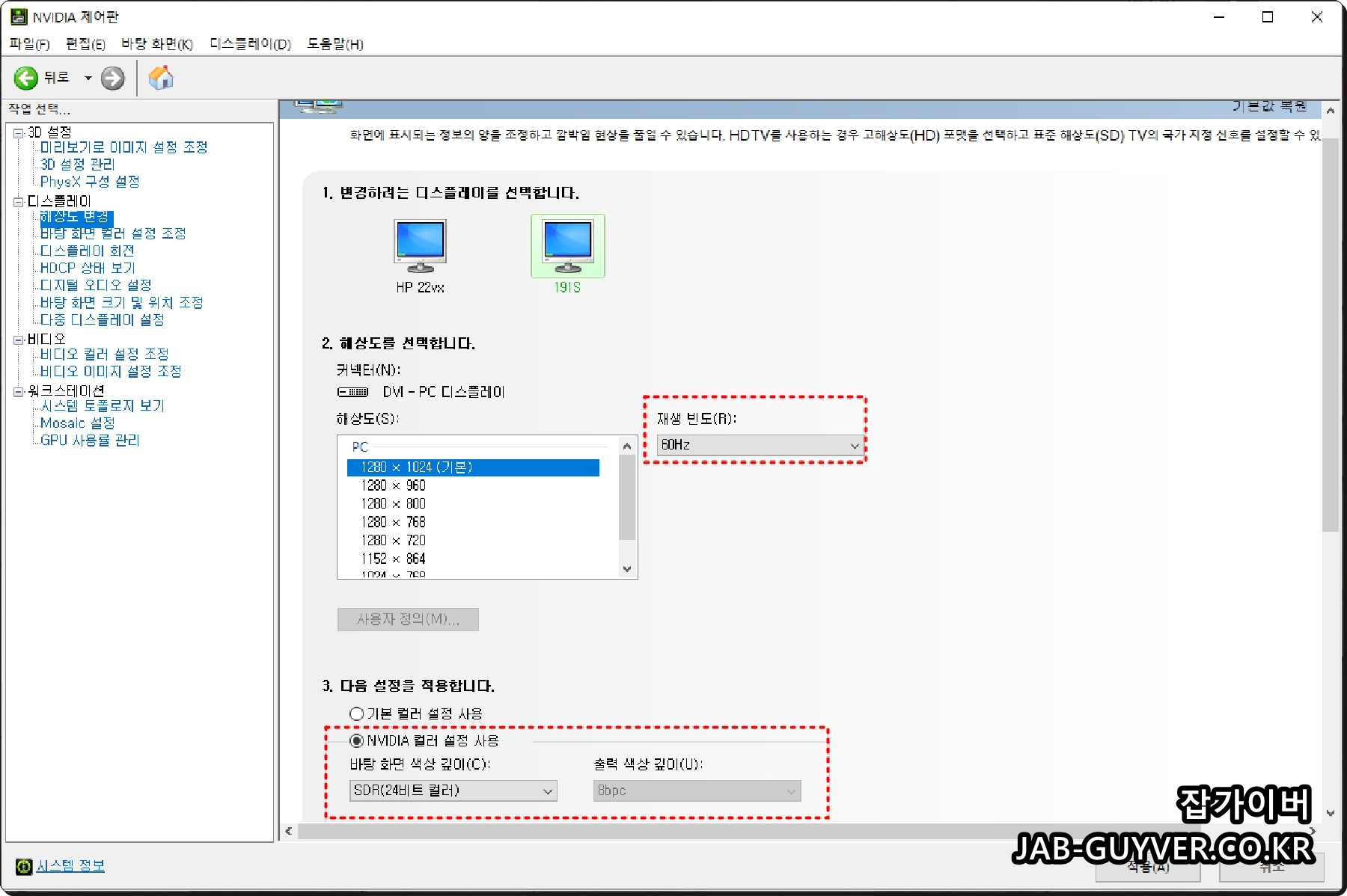 모니터 해상도 및 주사율 "재생빈도" 변경