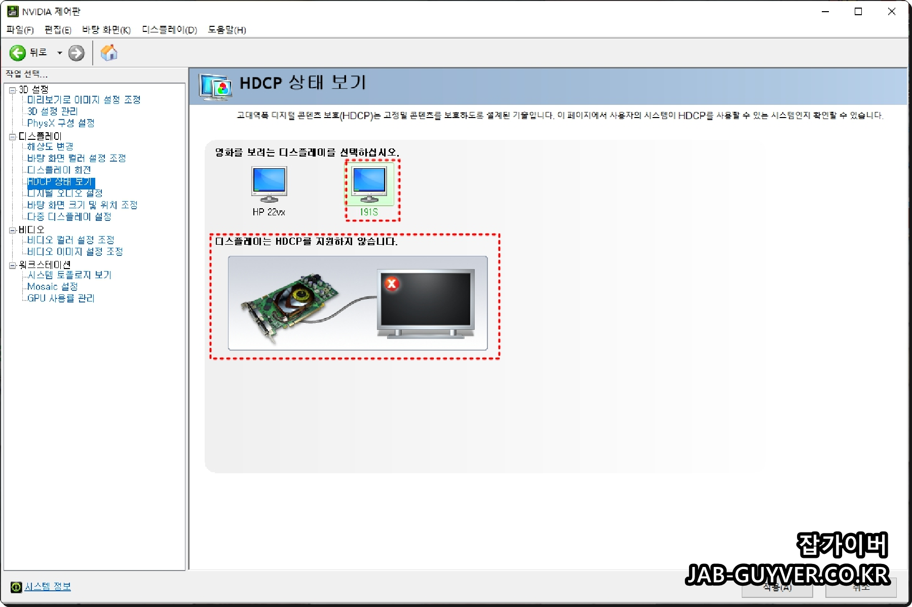 이 기능은 그래픽카드에서 HDCP 기능을 지원해야 사용가능하기 때문에 모니터에 메인보드 및 그래픽카드 어느쪽에 연결했느냐에 따라 사용이 불가능할 수 있습니다.