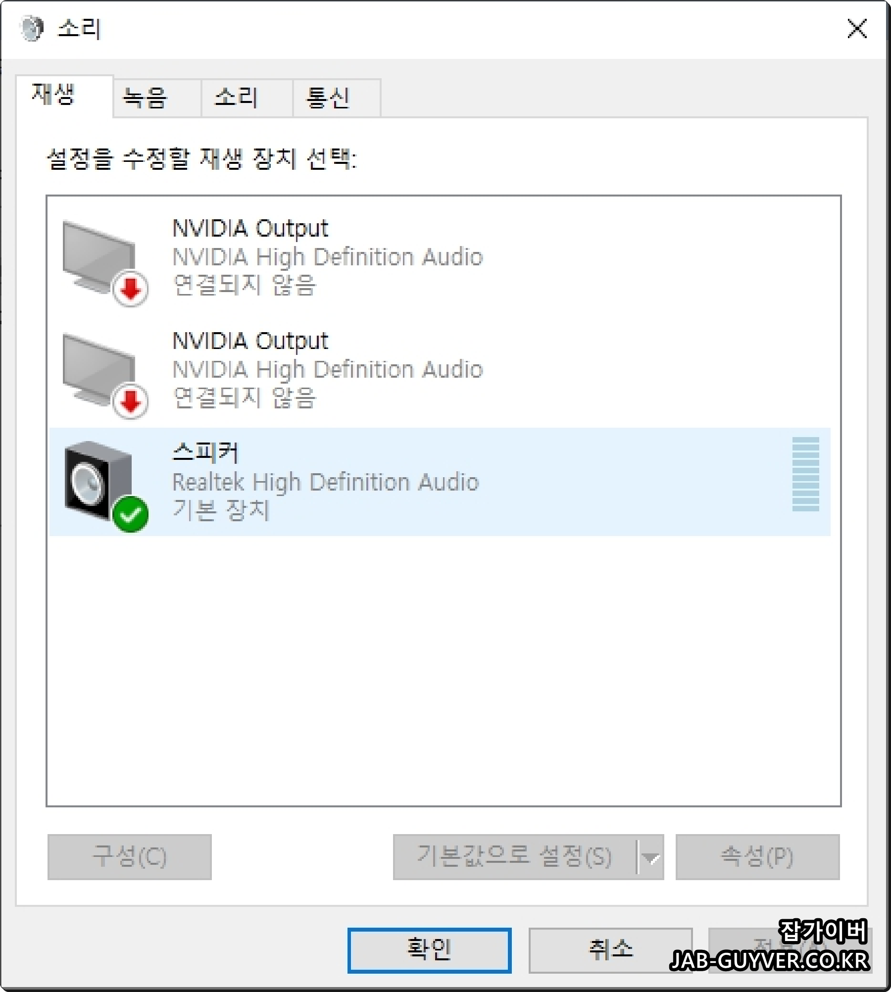 스피커 장치를 통해 현재 Nvidia High Definition Audio의 출력장치는 연결되지 않았으며 현재 연결된 사운드카드 "Realtek High Definition Audio"가 장착되어 작동중이며 사운드카드 작동을 테스트해볼 수 있습니다.