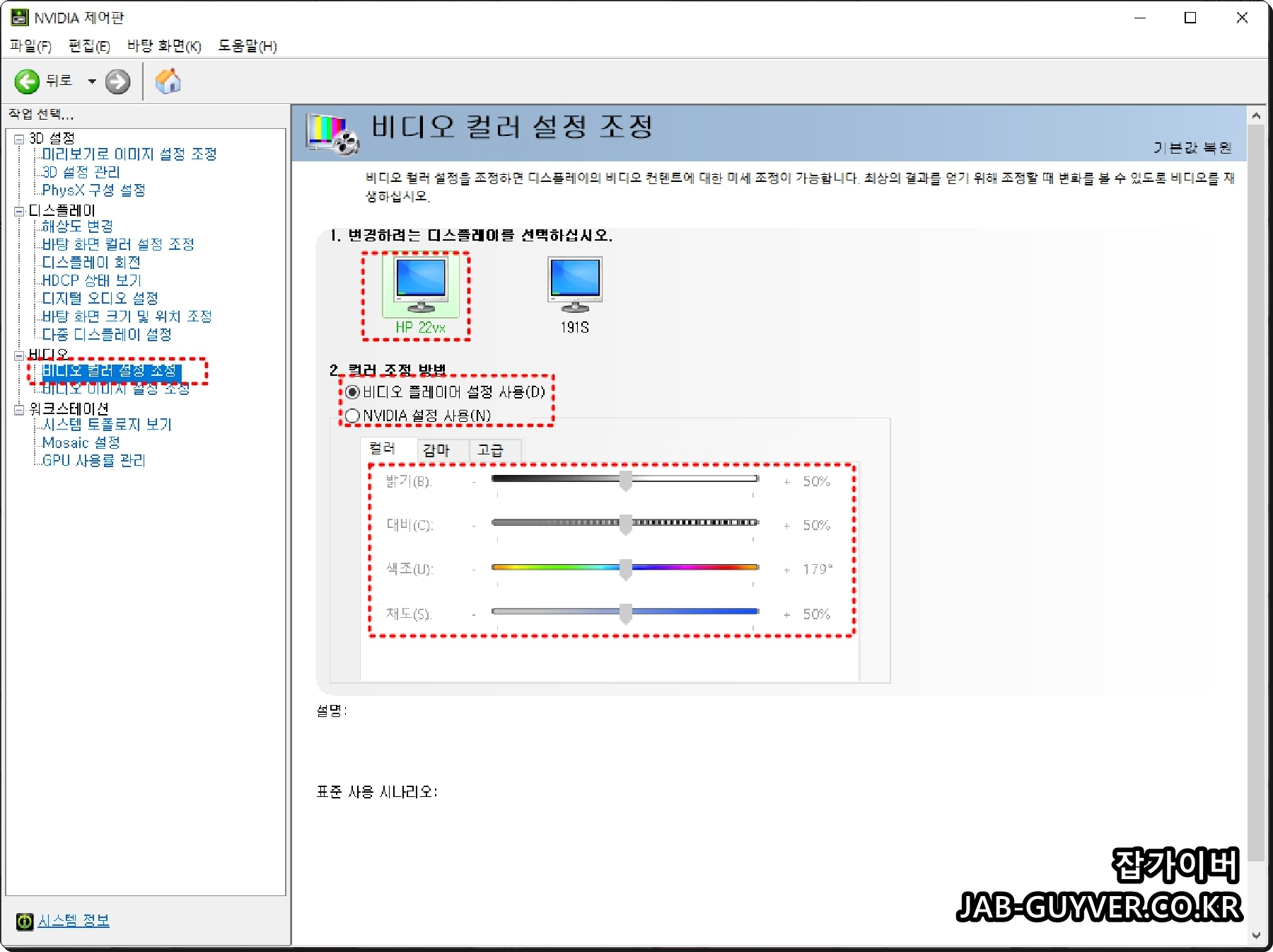 현재 사용하는 모니터의 밝기 및 대비, 색조, 채도등을 조절하며 이 컬러조정을 비디오 플레이어로 설정할 지 Nvidia 그래픽카드로 설정할지 조절합니다.