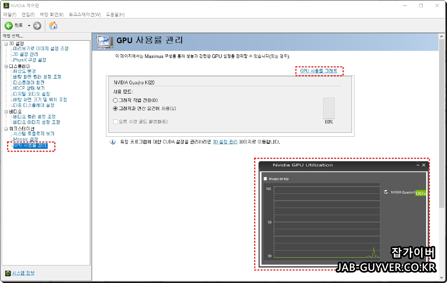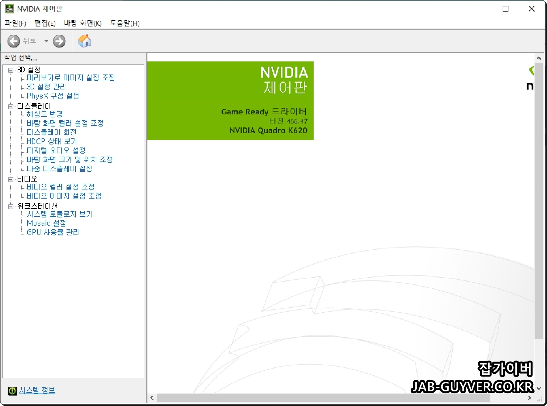 Nvidia 제어판을 실행한 보습으로 현재 설치된 그래픽카드 모델 "엔비디아 쿼드로 k620"의 드라이브 버전을 확인할 수 있습니다.