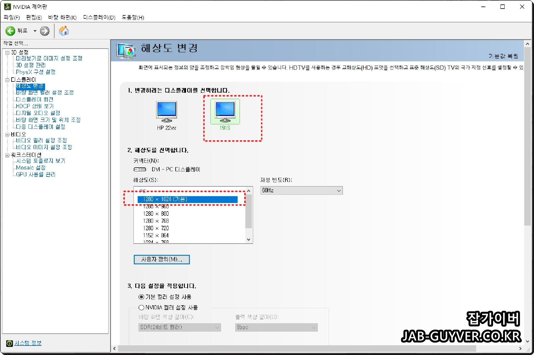 - '응용프로그램 제어'를 하시면 NVIDIA 제어판의 '해상도 변경'에서 별도로 설정 해주셔야 합니다.