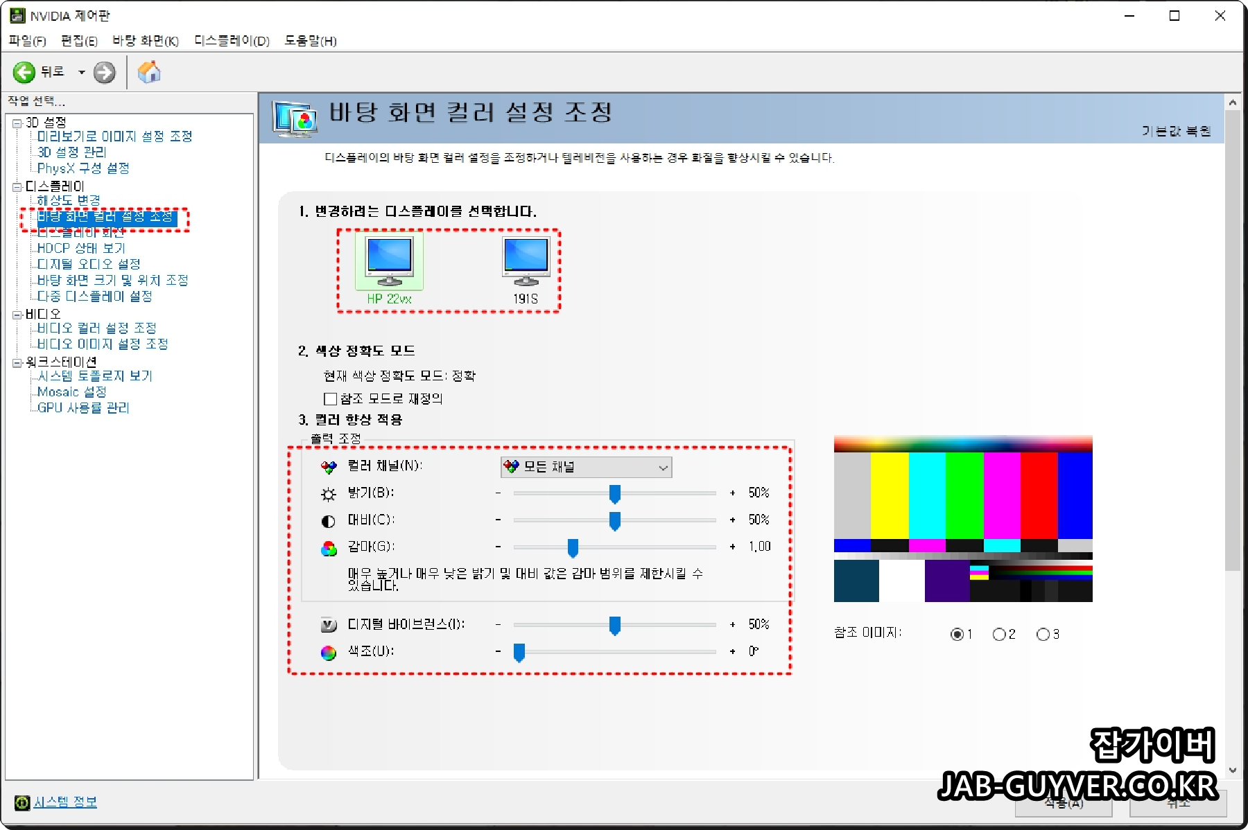 Nvidia 제어판을 통해 바탕화면 모니터의 컬러조절 및 밝기, 대비, 감마, 디지털밸런스, 색조등 색보정을 조절할 수 있습니다.