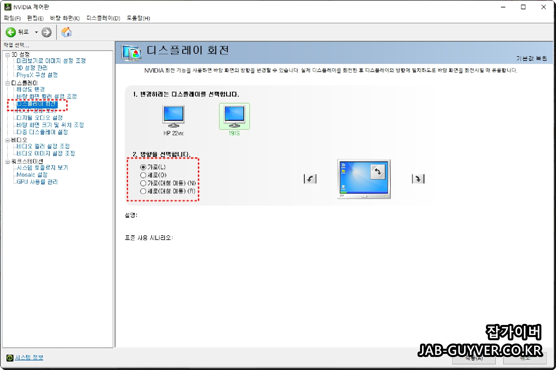 이런경우 디스플레이 회전탭을 통해 가로, 세로 등 모니터를 돌려 사용할 수 있습니다.