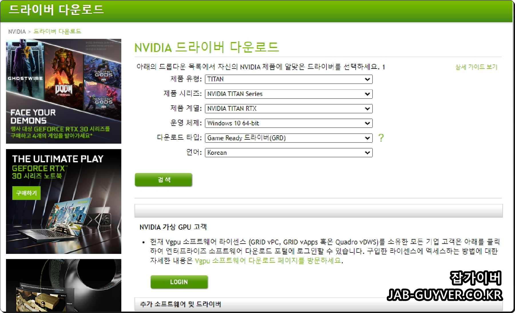 이후 엔비디아 홈페이지로 들어가 자신의 그래픽카드 종류와 윈도우 버전을 각각 선택해서 다운로드 받습니다.