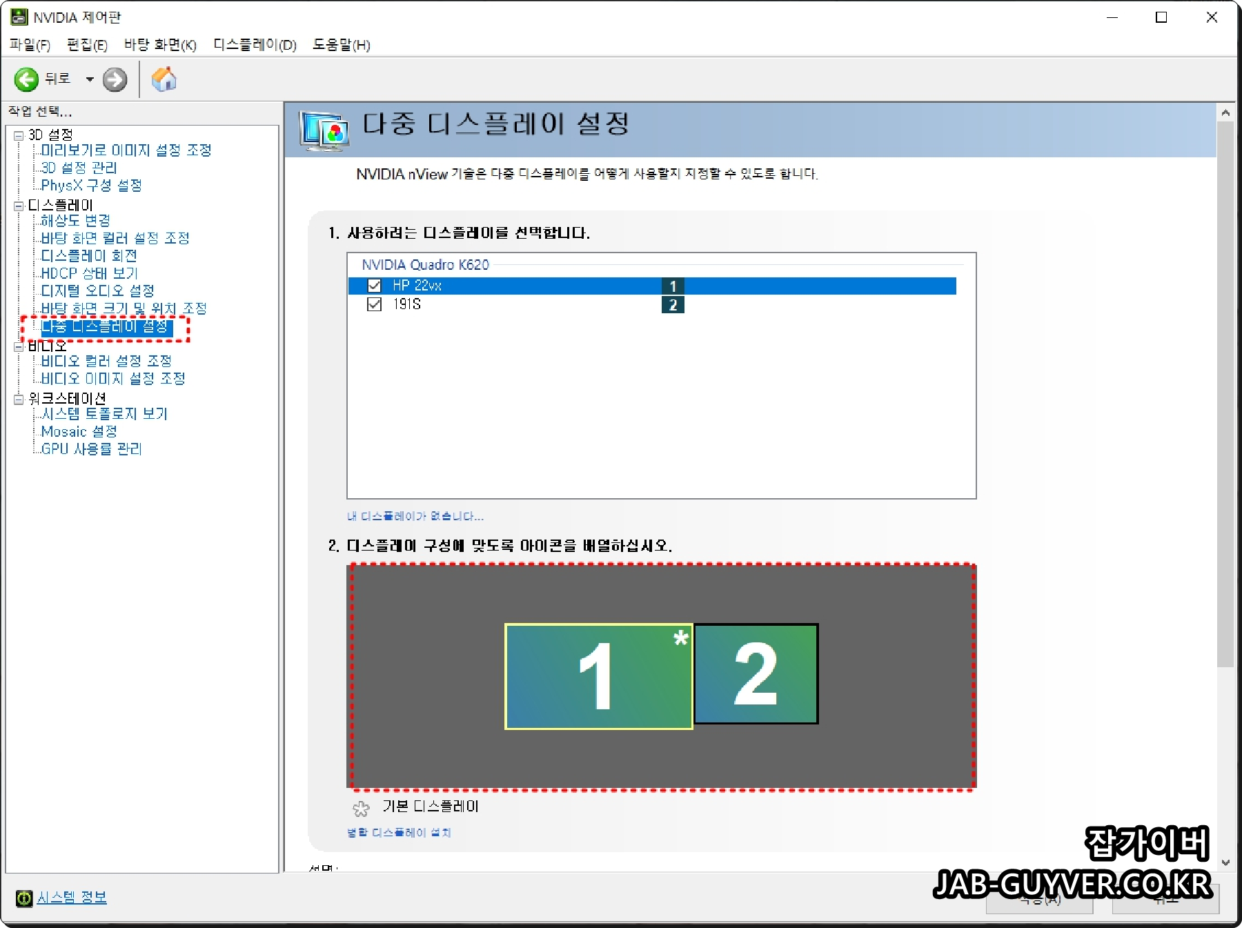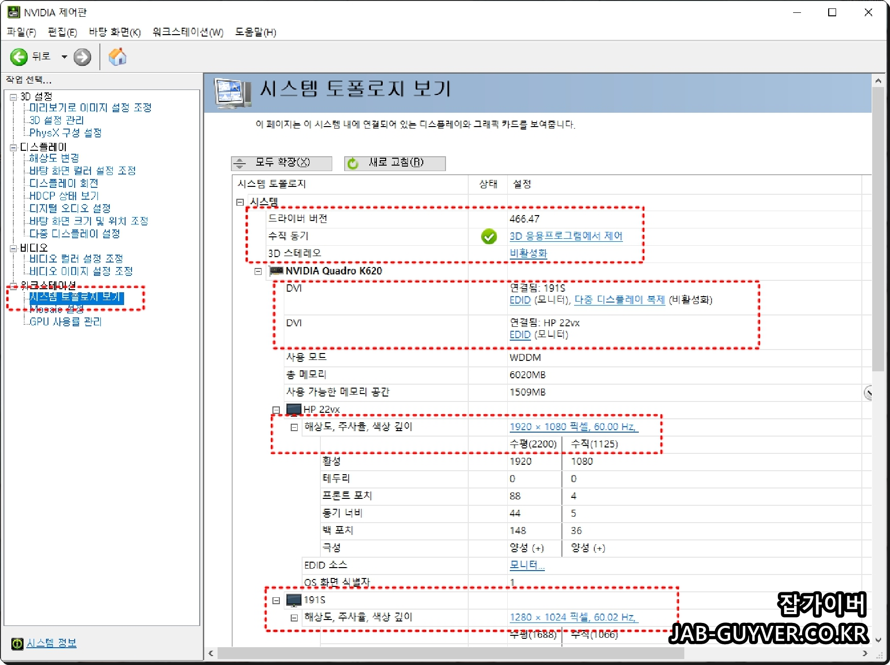 Nvidia 제어판을 실행한 보습으로 현재 설치된 그래픽카드 모델 "엔비디아 쿼드로 k620"의 드라이브 버전을 확인할 수 있습니다.