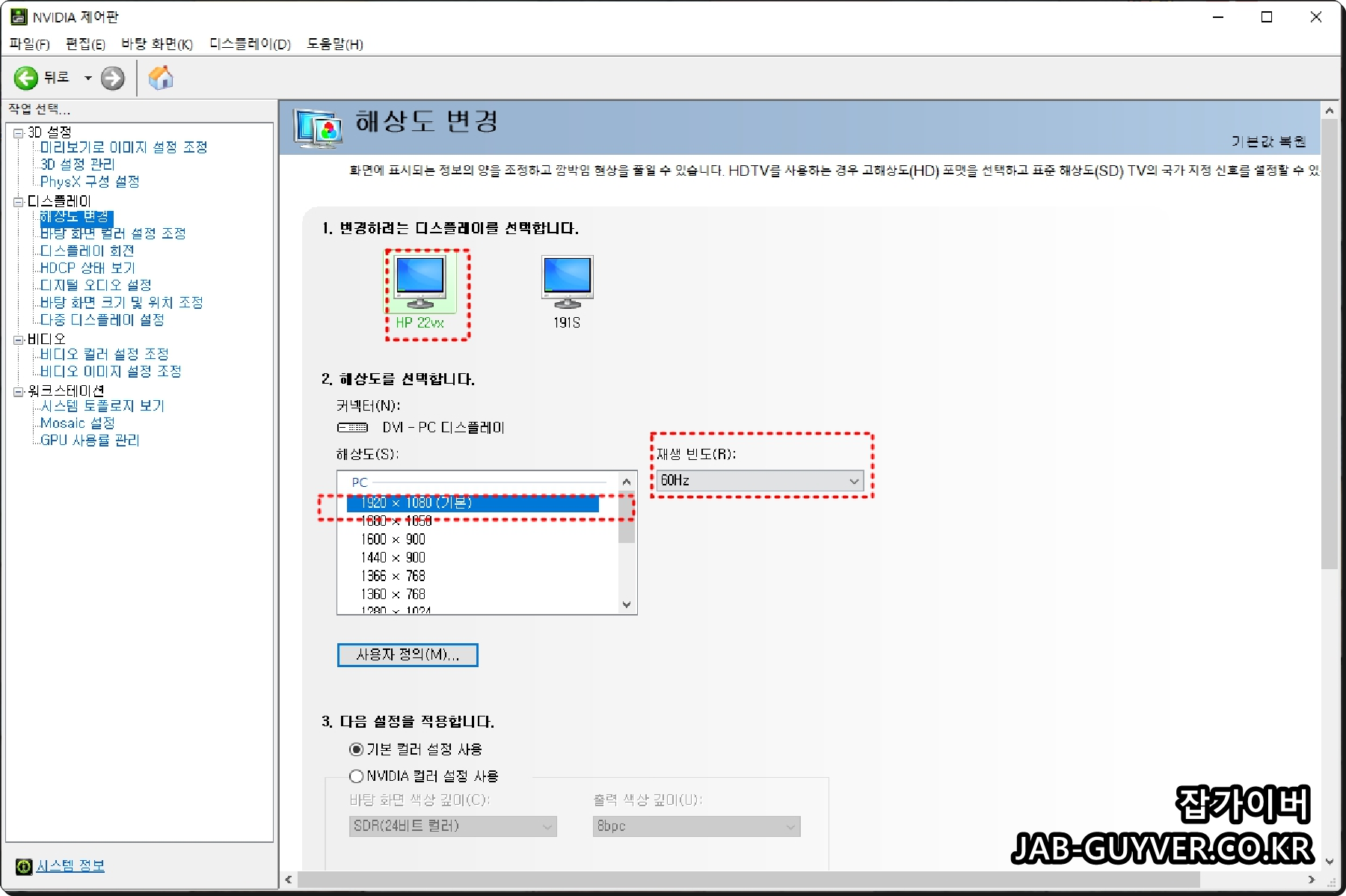 모니터 해상도 및 주사율 "재생빈도" 변경