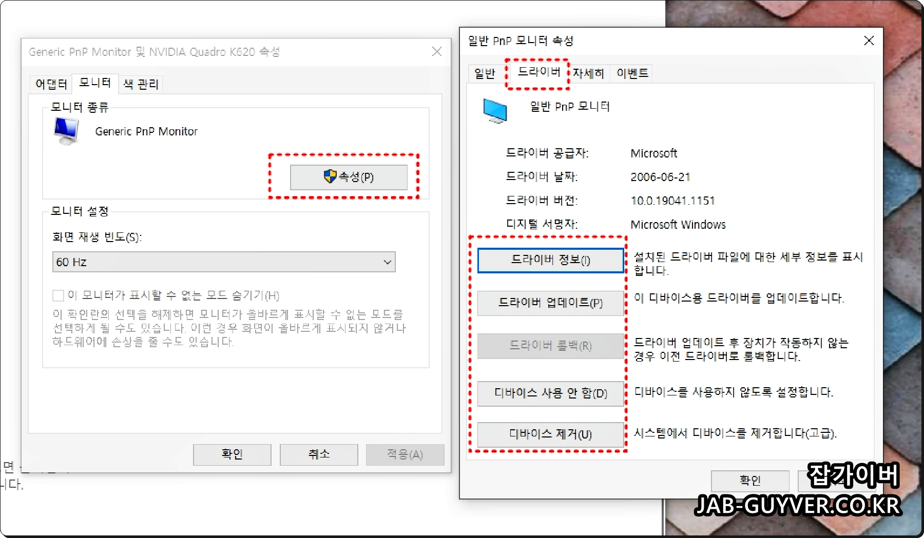 만약 그래픽카드 및 모니터에 대한 색상에 문제가 있다면 모니터 종류 -> 속성 -> 드라이버로 들어가 그래픽카드 드라이브를 삭제 후 다시 설치합니다.
