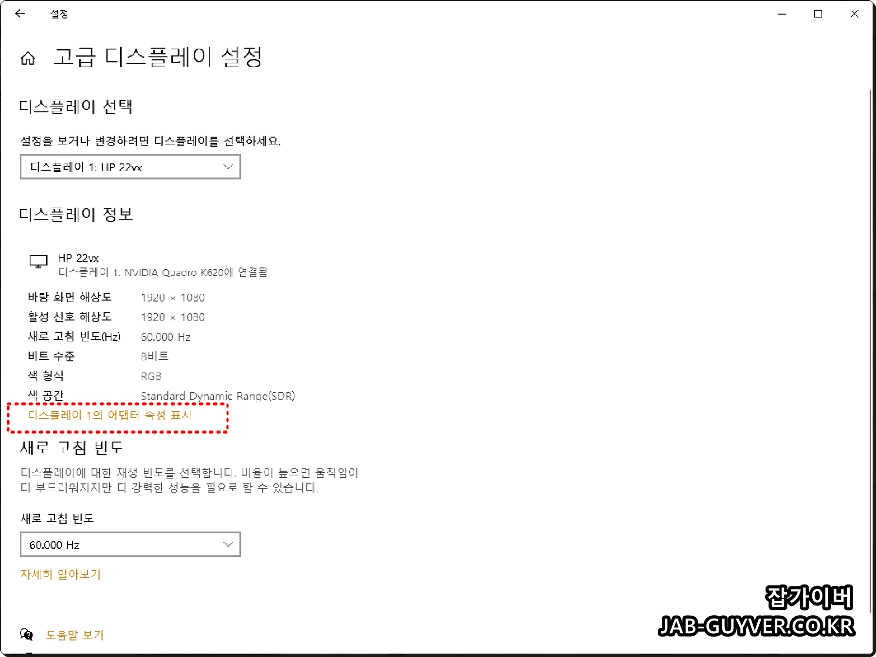 현재 모니터의 해상도 및 새로고침 빈도 (hz), 비트수준, 색형식, 공간등을 확인할 수 있습니다.